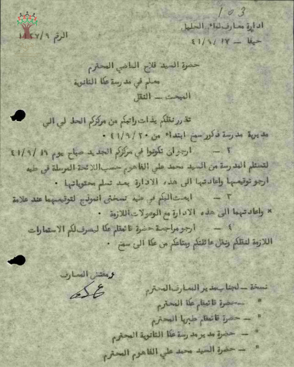 نقل المعلم فلاح الماضي من مدرسة عكا الى مدرسة سمخ للذكور