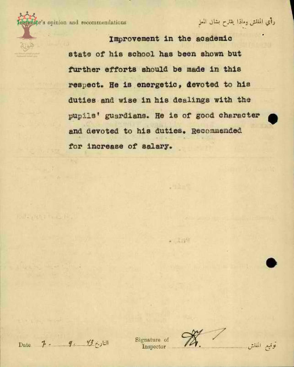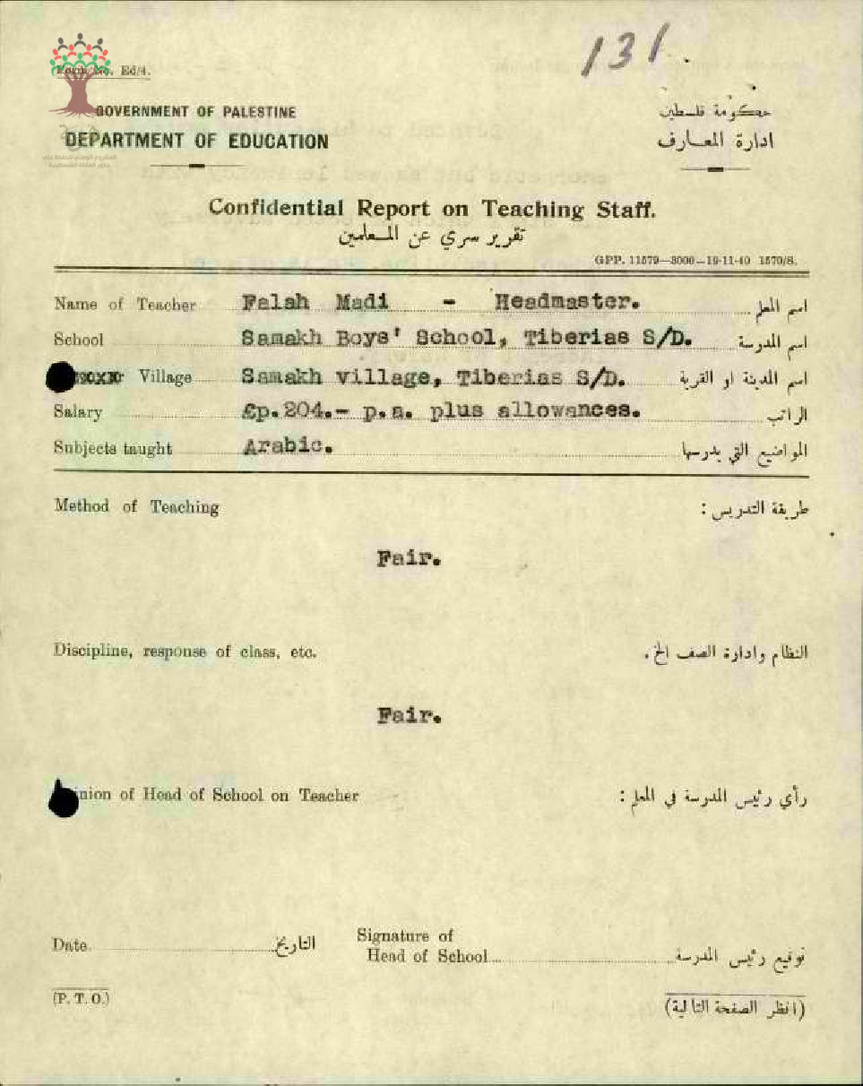 تقرير تفصيلي عن أداء المعلم فلاح الماضي في مدرسة سمخ سنة 1944