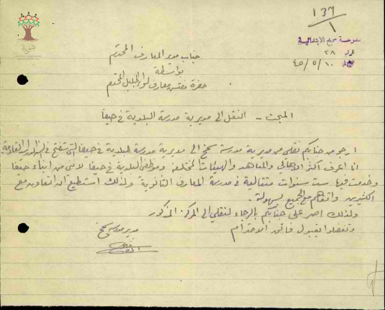 رسالة من المعلم فلاح الماضي الى مفتش المعارف يطلب نقله الى مديرية مدرسة البلدية في حيفا