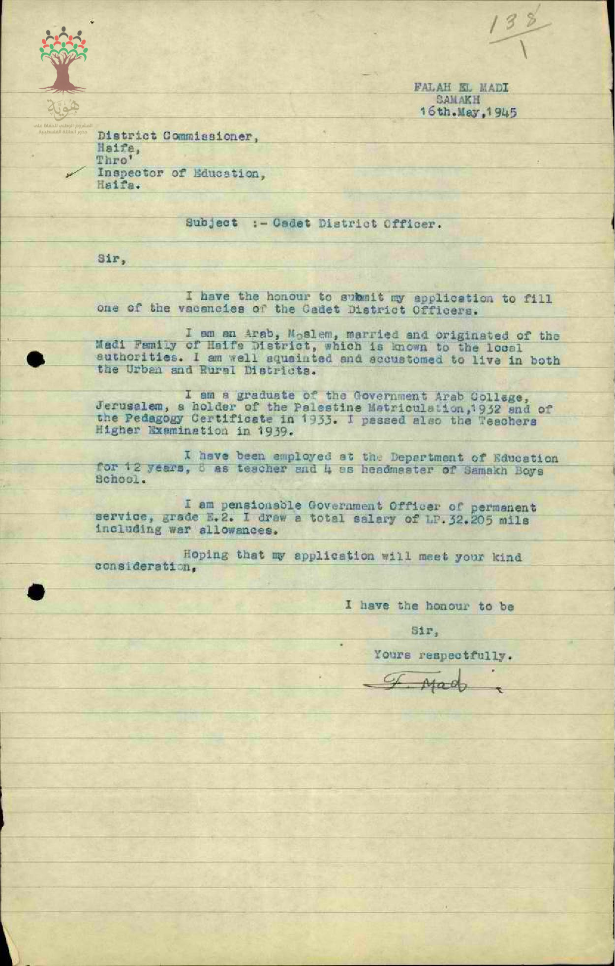 رسالة من المعلم فلاح الماضي الى مفتش المعارف يطلب نقله الى ادارة المنطقة