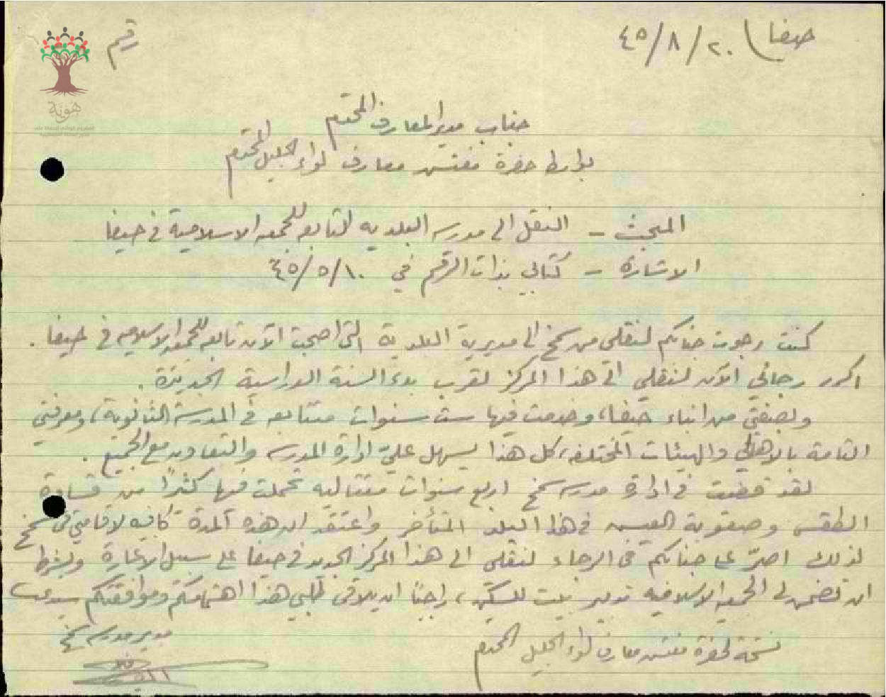 رسالة من المعلم فلاح الماضي الى مفتش المعارف يطلب نقله الى مدرسة البلدية التابعة الى الجمعية الاسلامية في حيفا