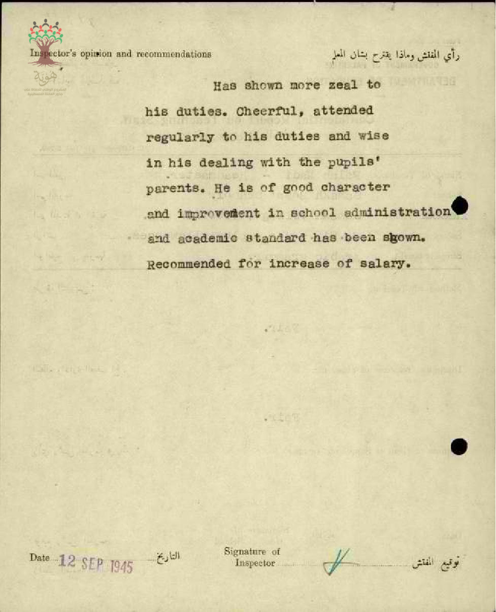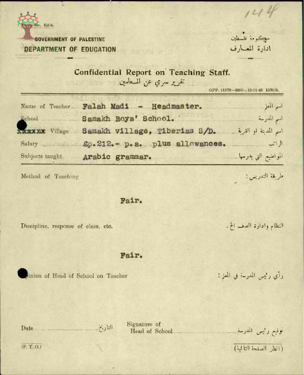 تقرير تفصيلي عن أداء المعلم فلاح الماضي في مدرسة سمخ سنة 1945