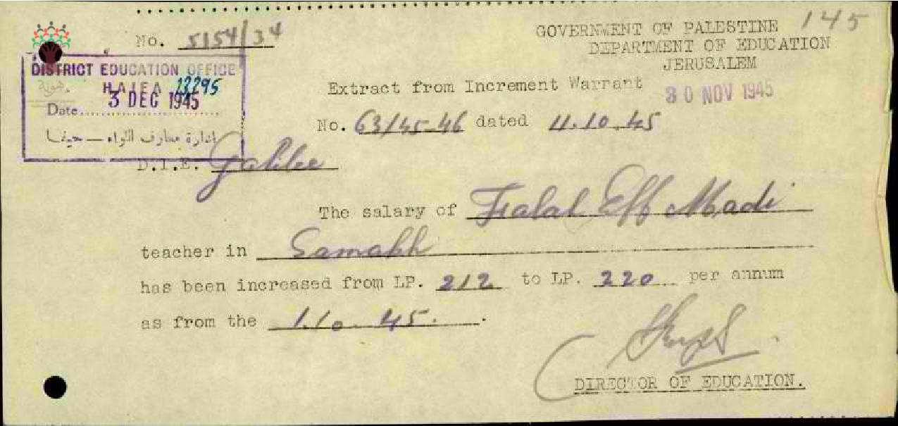 رسالة من مدير المعارف الى مفتش المعارف بخصوص زيادة راتب المعلم فلاح الماضي السنوية