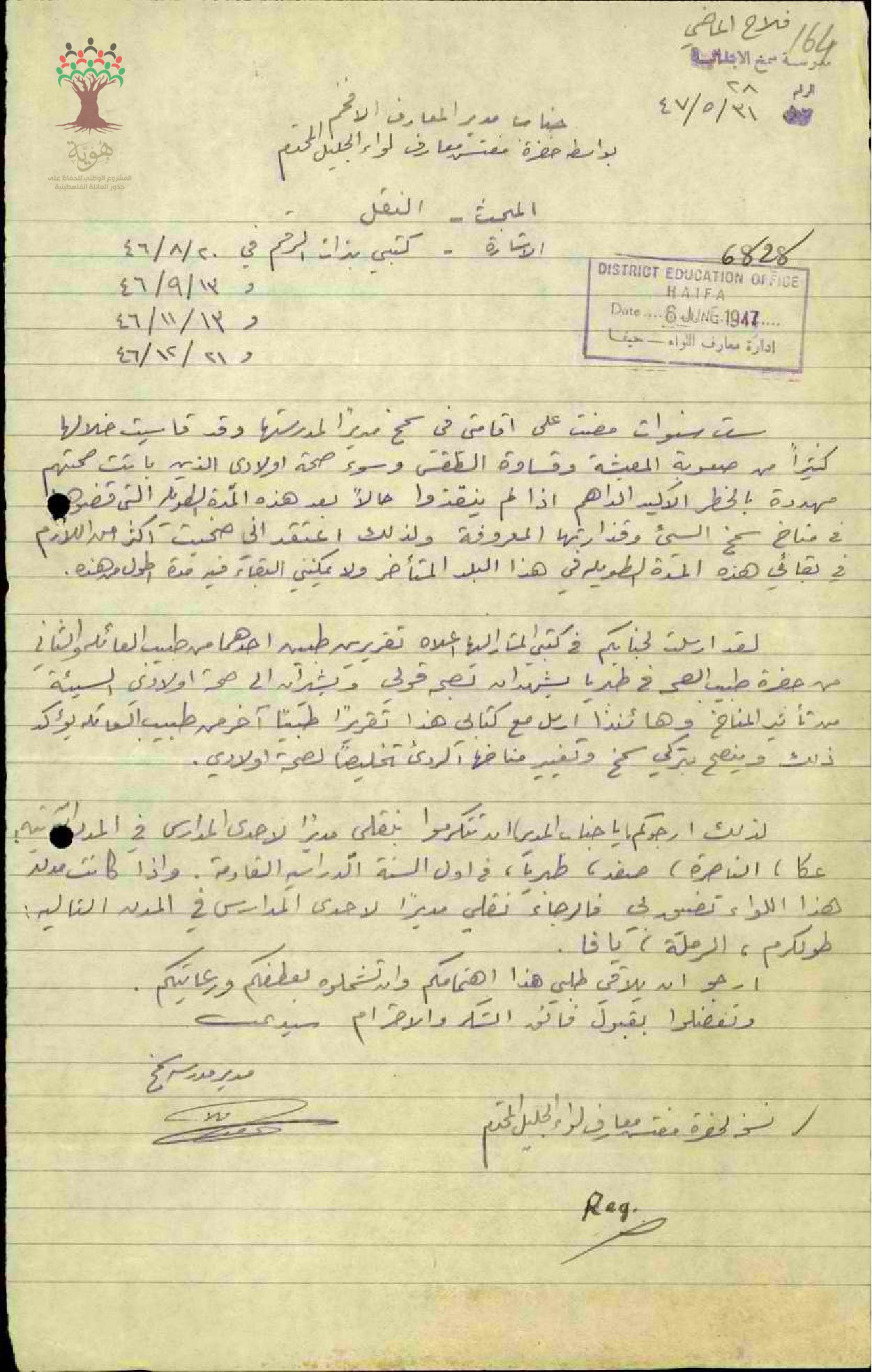 رسالة من المعلم فلاح الماضي الى مفتش المعارف يطلب فيها نقله من مدرسة سمخ