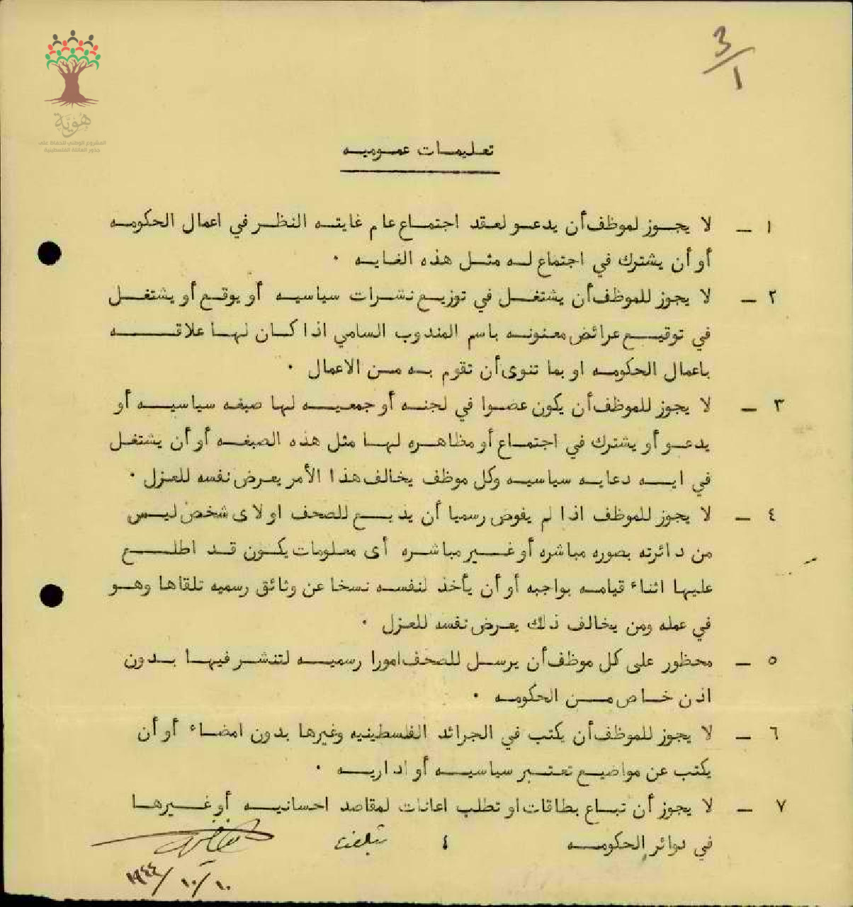 توقيع المعلم نايف خرما على التعليمات العمومية لإدارة المعارف