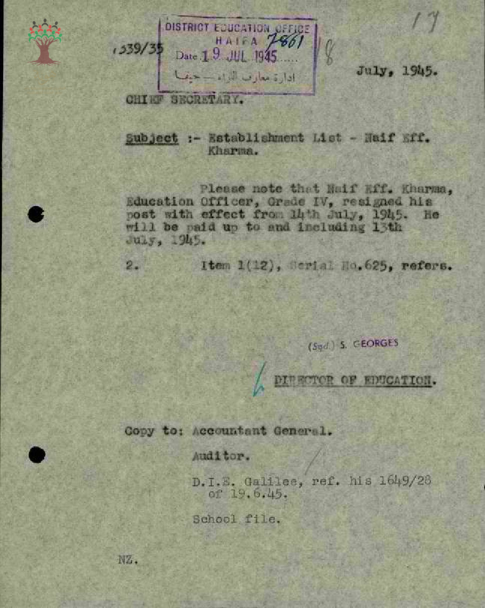 رسالة من مدير المعارف الى رئيس السكرتارية بخصوص استقالة المعلم نايف خرما