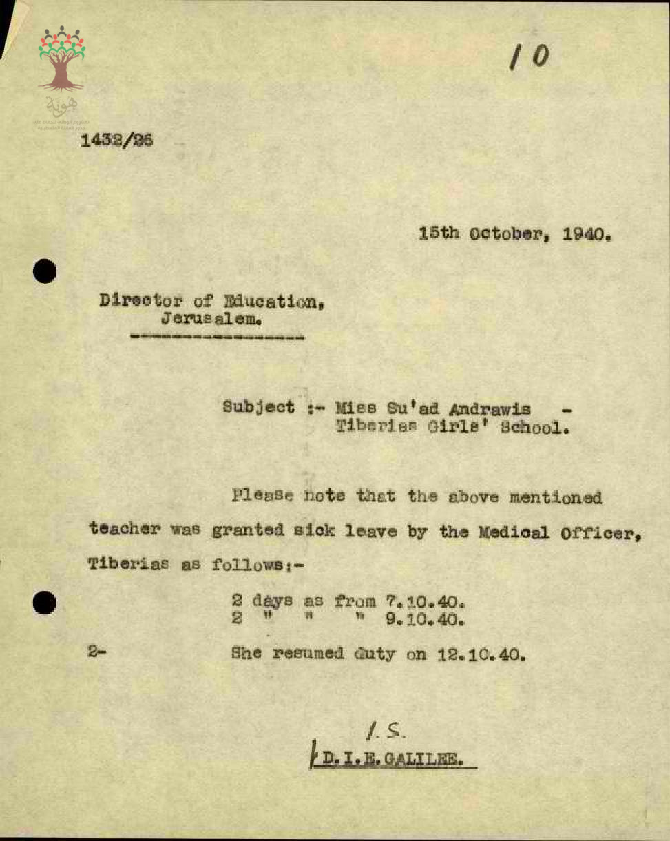 رسالة من مفتش المعارف الى مدير المعارف بخصوص اجازة مرضية للمعلمة سعاد اندراوس وعودتها الى العمل