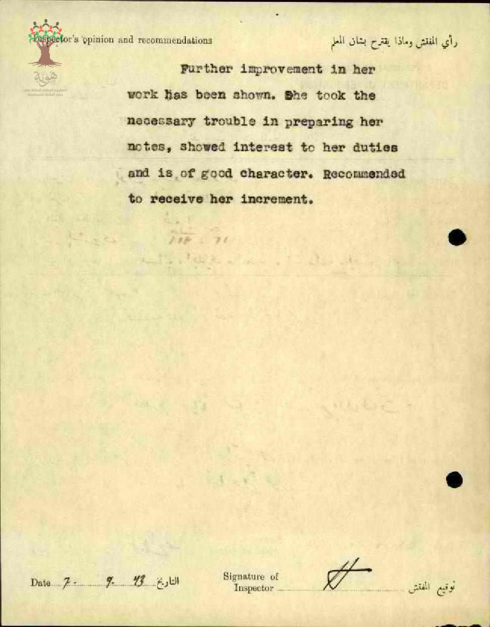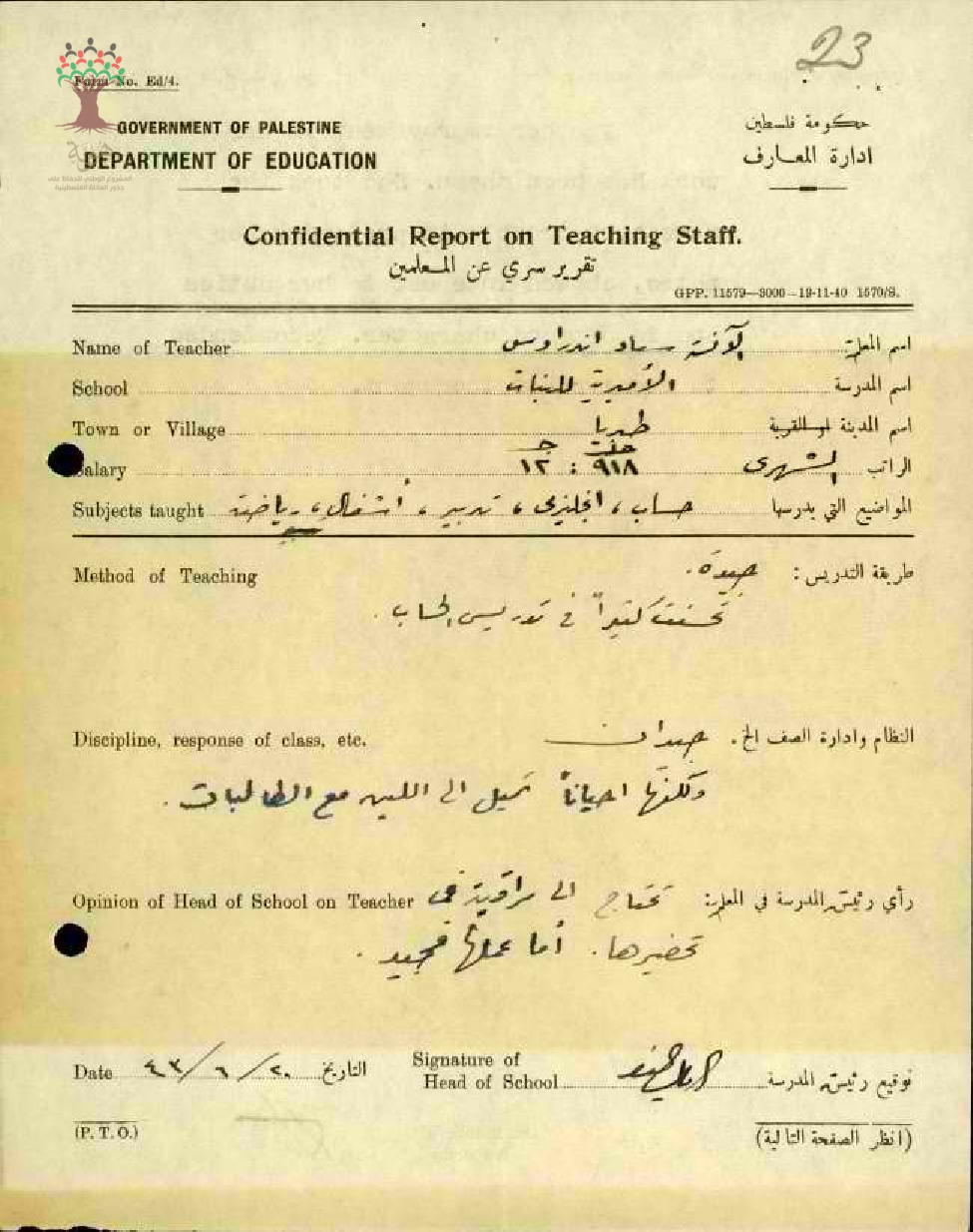 تقرير تفصيلي عن أداء المعلمة سعاد حبيب اندراوس في مدرسة طبريا للبنات سنة 1943