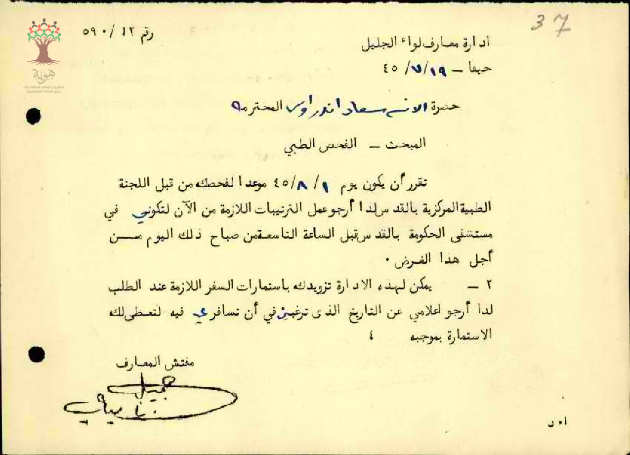 رسالة من مفتش المعارف الى المعلمة سعاد اندراوس يطلب منها التواجد في القدس لاجراء الفحص الطبي
