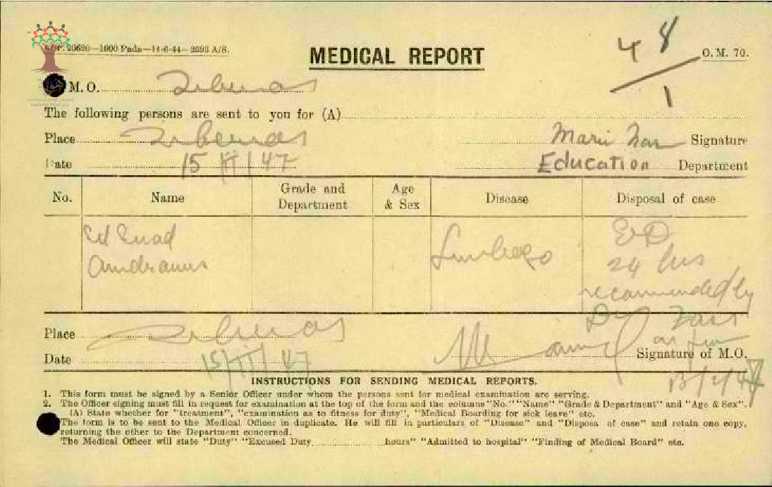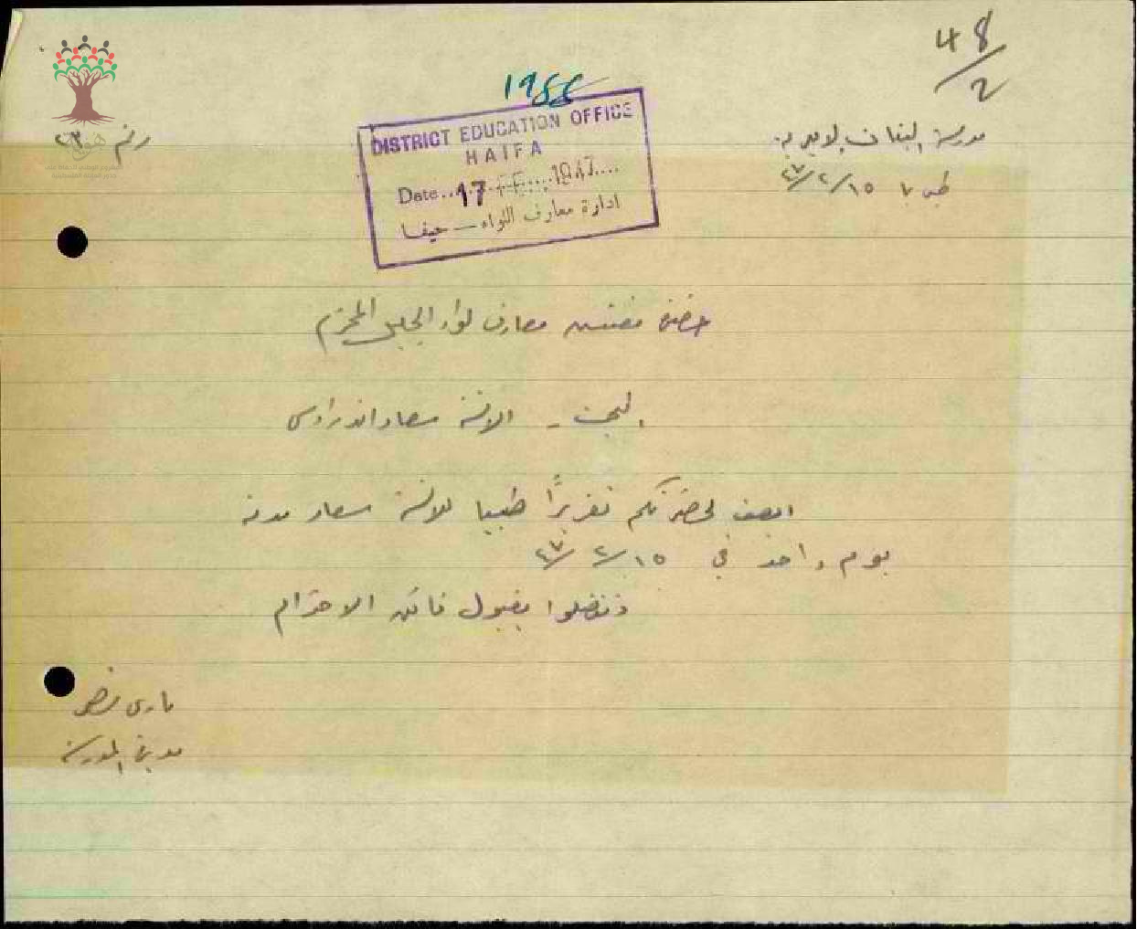 رسالة من مديرة مدرسة طبريا الى مفتش المعارف بخصوص تغيب المعلمة سعاد اندراوس مرفقة بالتقرير الطبي