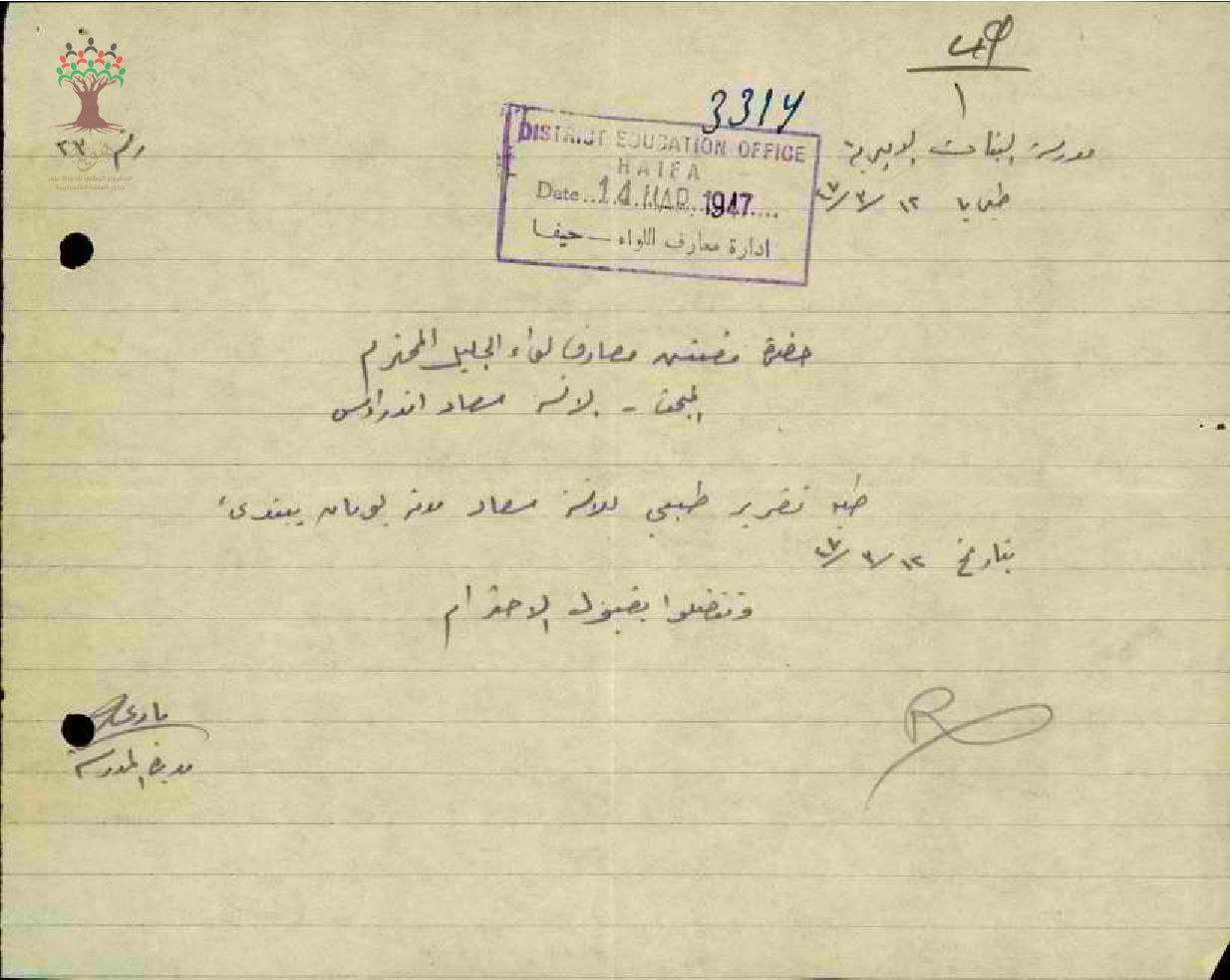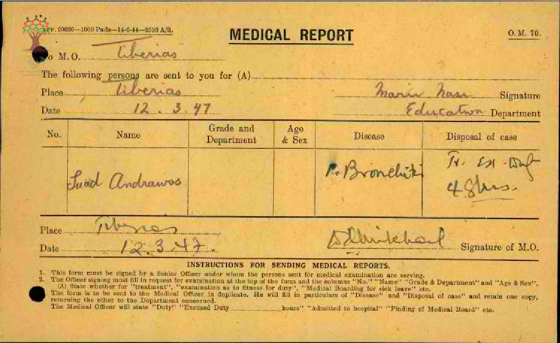 رسالة من مديرة مدرسة طبريا الى مفتش المعارف بخصوص تغيب المعلمة سعاد اندراوس مرفقة بالتقرير الطبي