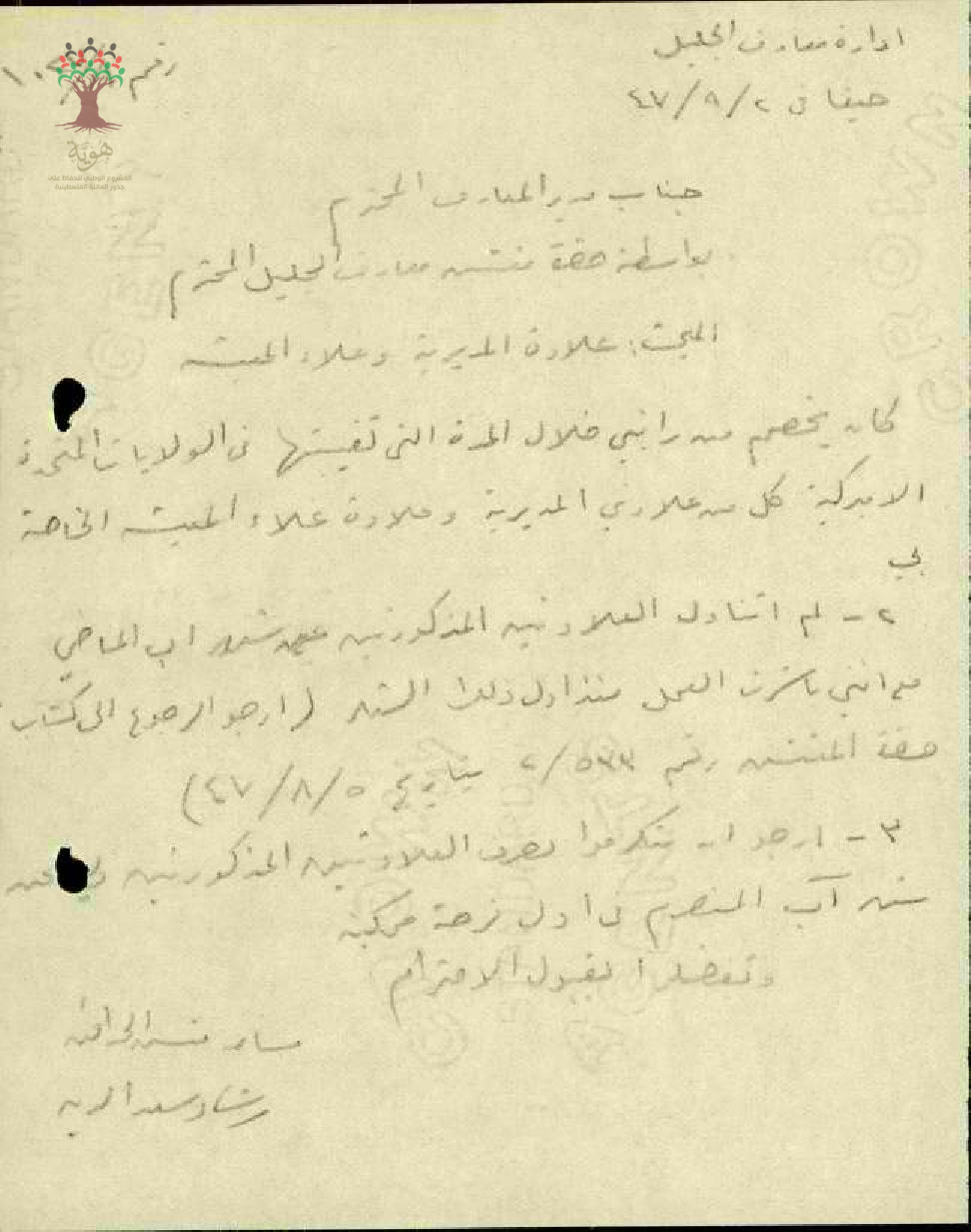 رسالة إلى مدير مفتش المعارف بواسطة مفتش المعارف بخصوص المعلم رشاد سعد الدين في مدرسة علما المبحث علاوة غلاء المعيشة وعلاوة المديرية