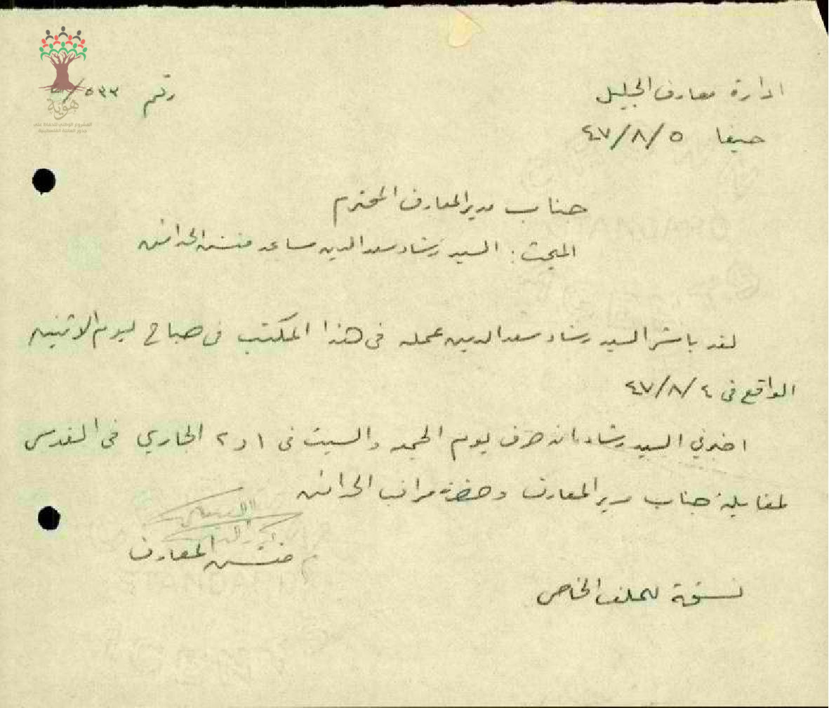 رسالة من مفتش المعارف إلى مدير المعارف بخصوص المعلم رشاد سعد الدين مباشرة عمله في مكتبه يوم الإثنين