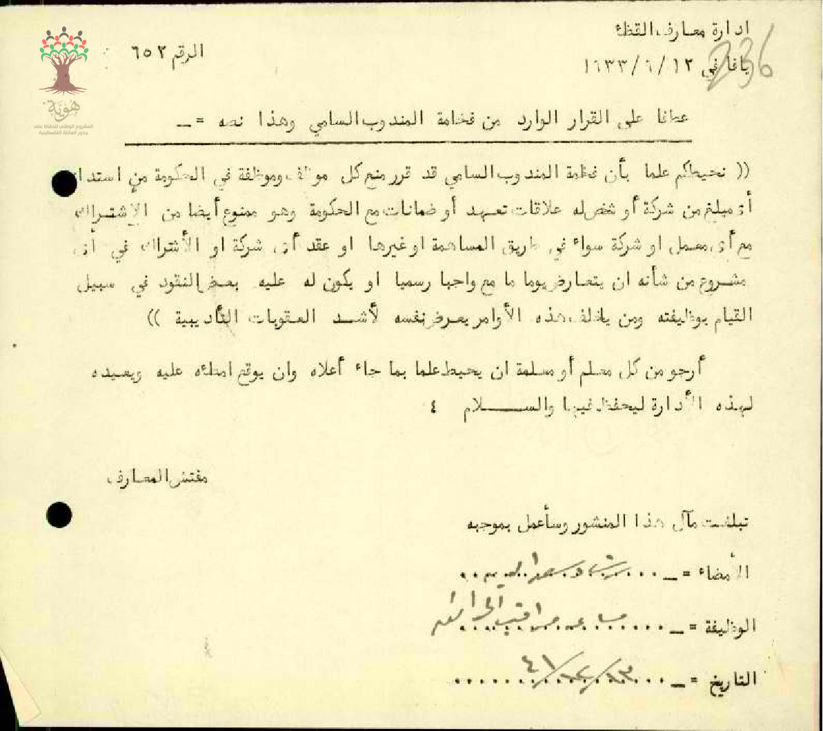 رسالة تعميم من مفتش المعارف عطفا على القرار الورد في رسالة المندوب السامي بخصوص عدم قبول الحكومة من استدعاء اي موظف لديها قدم ضمانات للحكومة من قبل الشركات المتعهدة أو أشخاص
