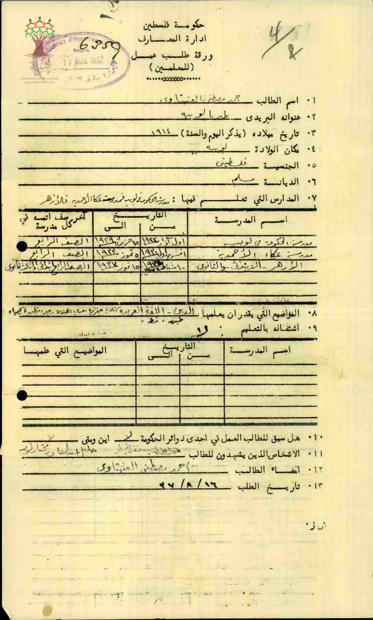 ورقة طلب عمل للمعلم أحمد عنبتاوي/ لوبية
