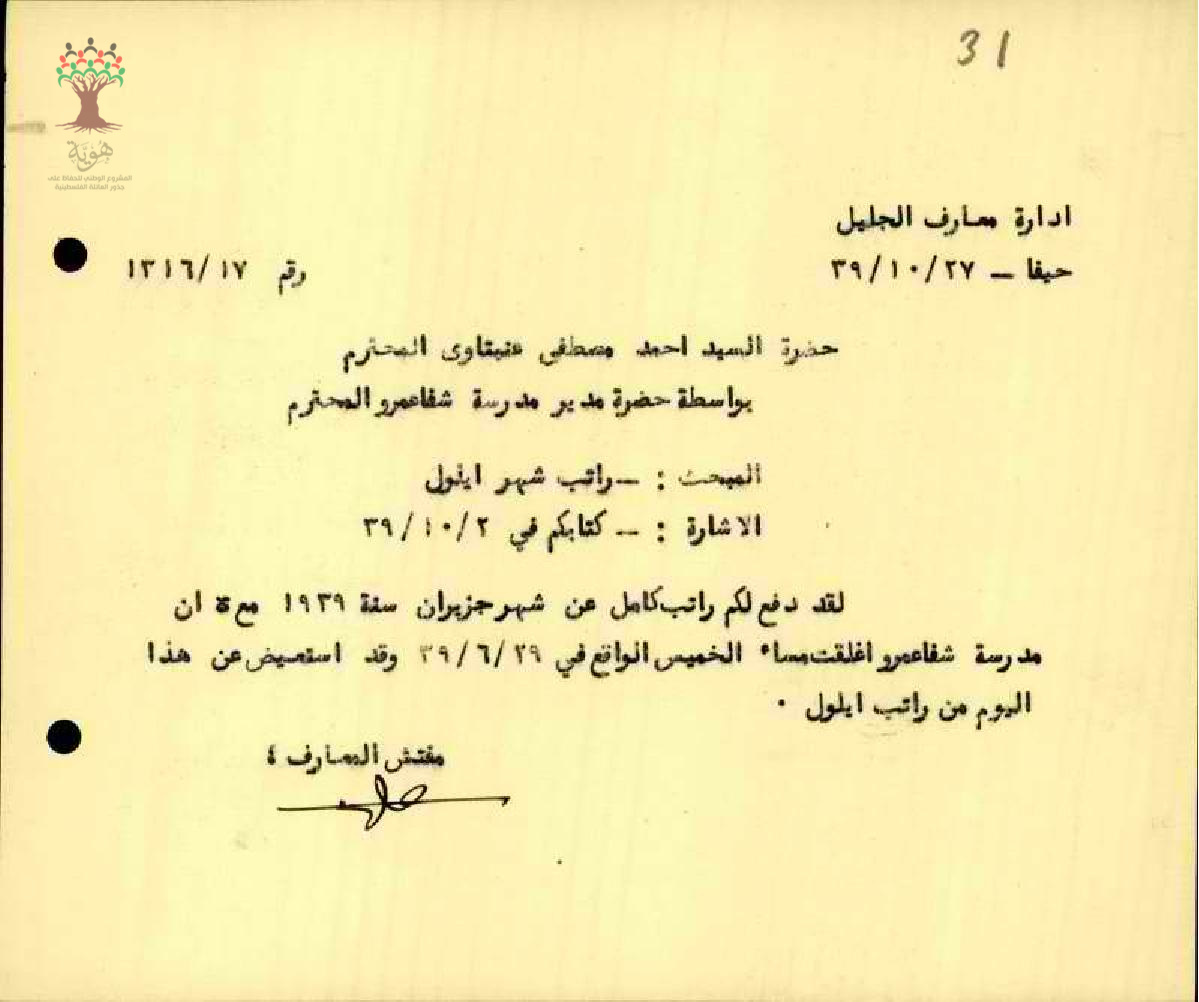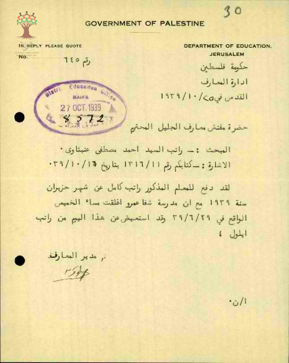 رسالة من مدير المعارف إلى مفتش المعارف يبحث معه أمر دفع راتب المعلم أحمد عنبتاوي