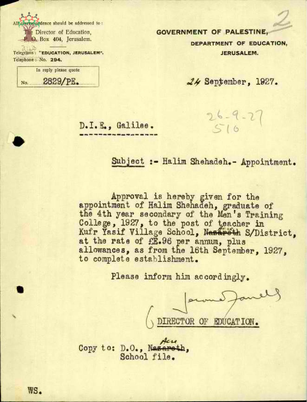رسالة من مدير المعارف الى مفتش المعارف بخصوص تعيين المعلم حليم شحادة