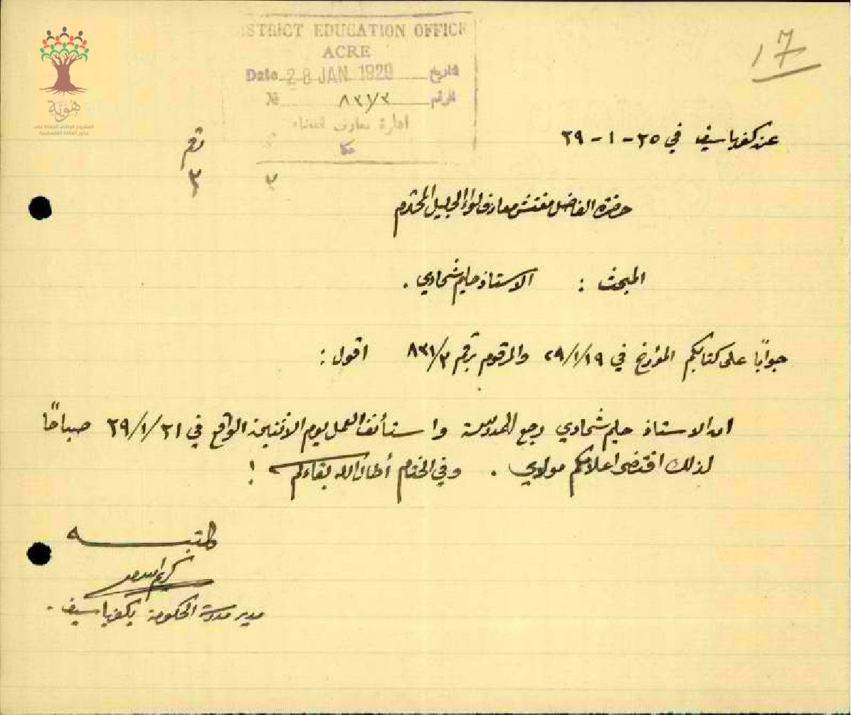 رسالة من مدير مدرسة كفر ياسيف الى مفتش المعارف بخصوص عودة المعلم حليم شحادة الى العمل