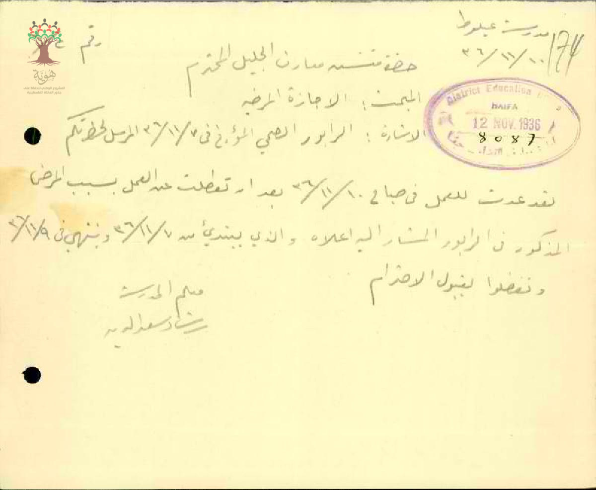 رساله من المعلم رشاد سعد الدين الى مفتش معارف الجليل بخصوص الاجازة المرضيه