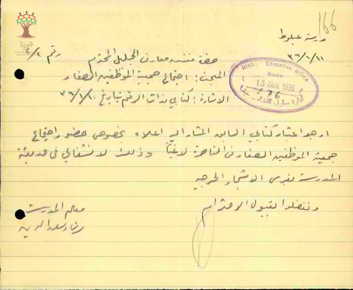 رساله من المعلم رشاد سعد الدين الى مفتش معارف الجليل بخصوص اجتماع جمعية الموظفينه الصغار