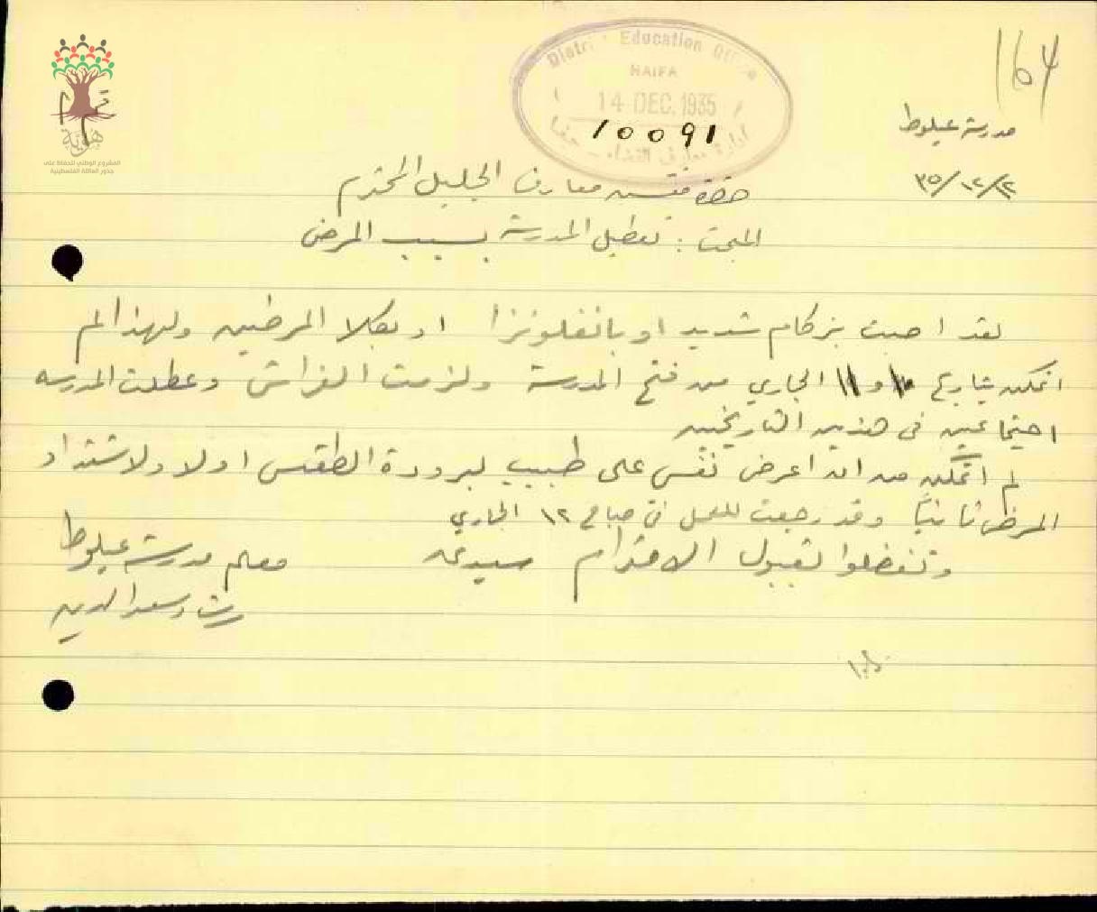 رساله من العلم رشاد سعد الدين الى مفتش معارف الجليل بخصوص تعطيل المدرسة بسبب المرضى
