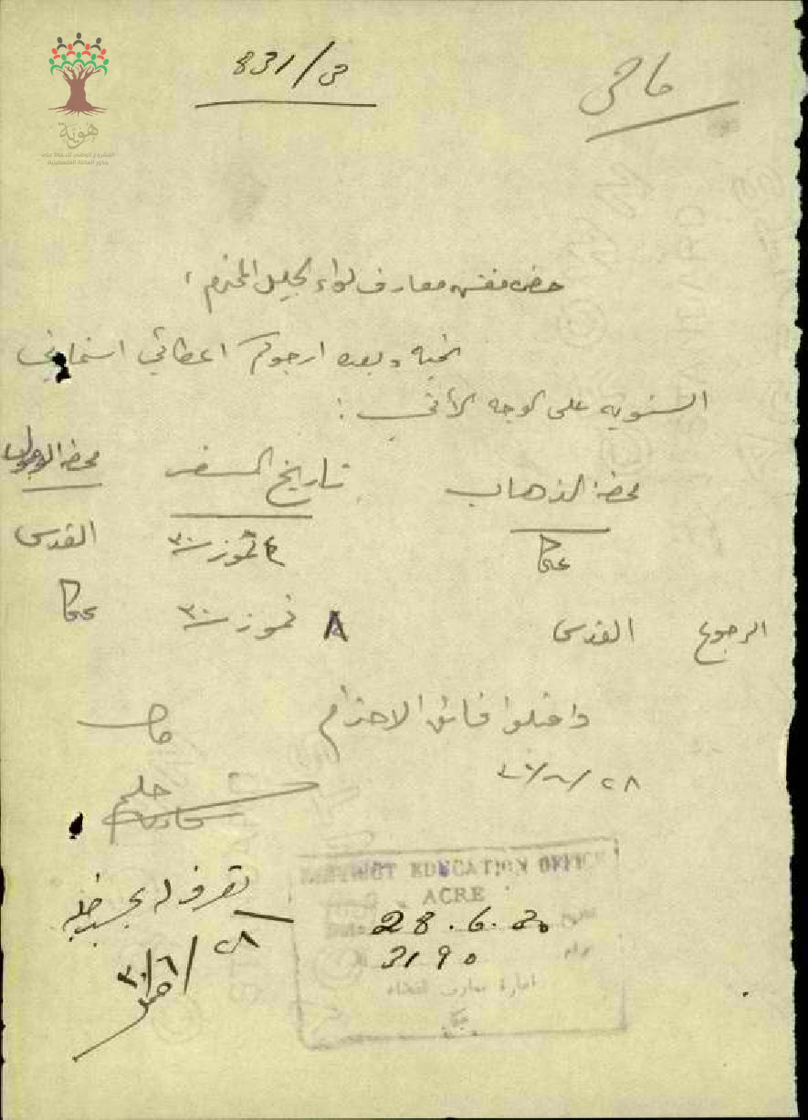 رسالة من المعلم حليم شحادة الى مفتش المعارف يطلب فيها استمارته السنوية