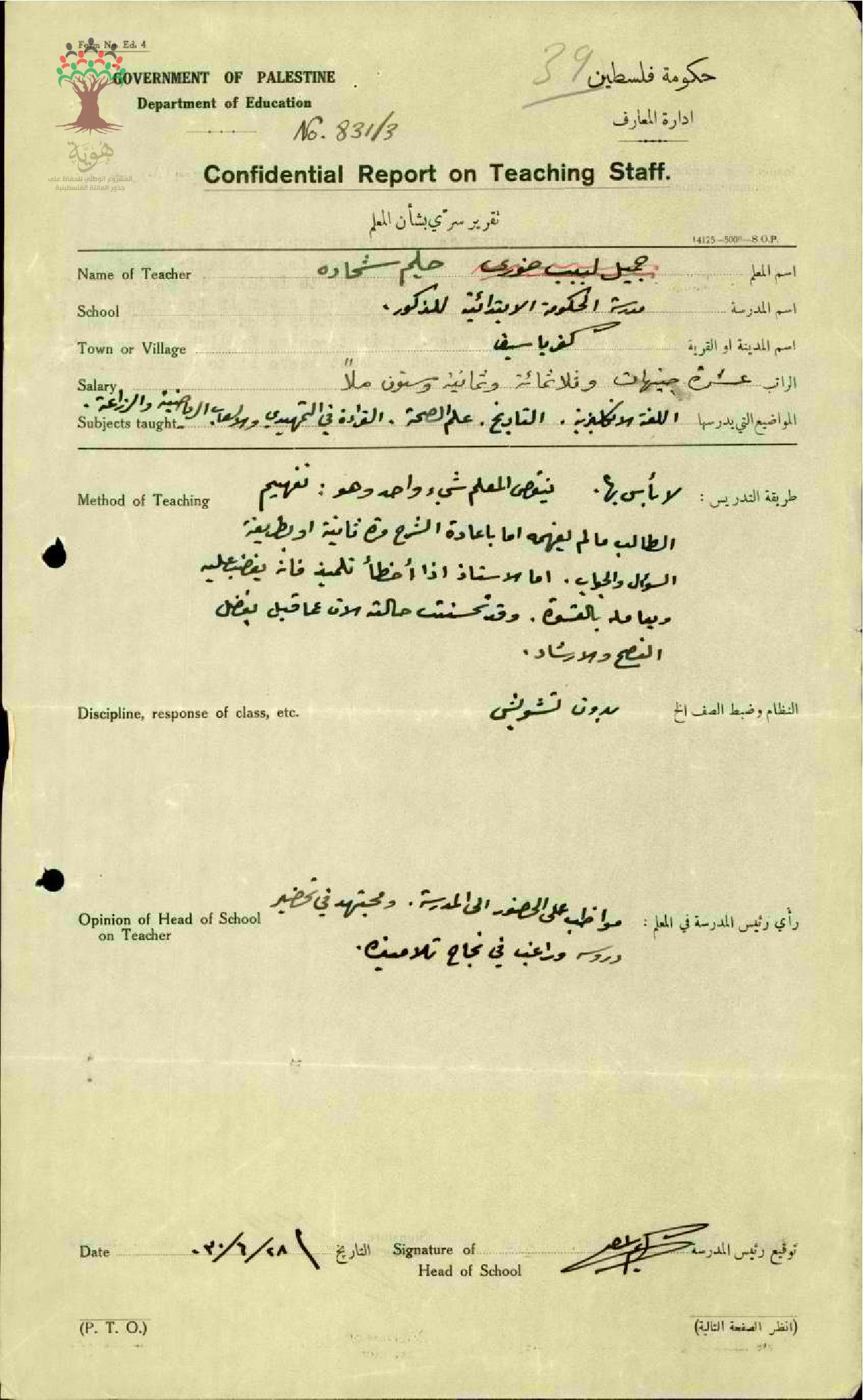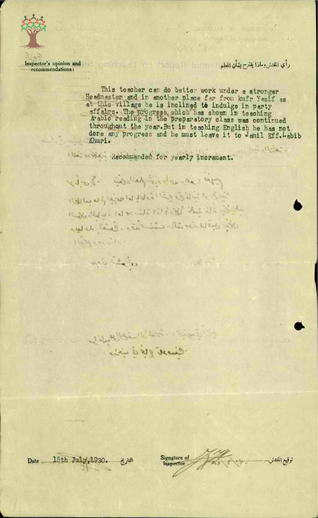 تقرير تفصيلي عن أداء المعلم حليم شحادة في مدرسة كفر ياسيف سنة 1930