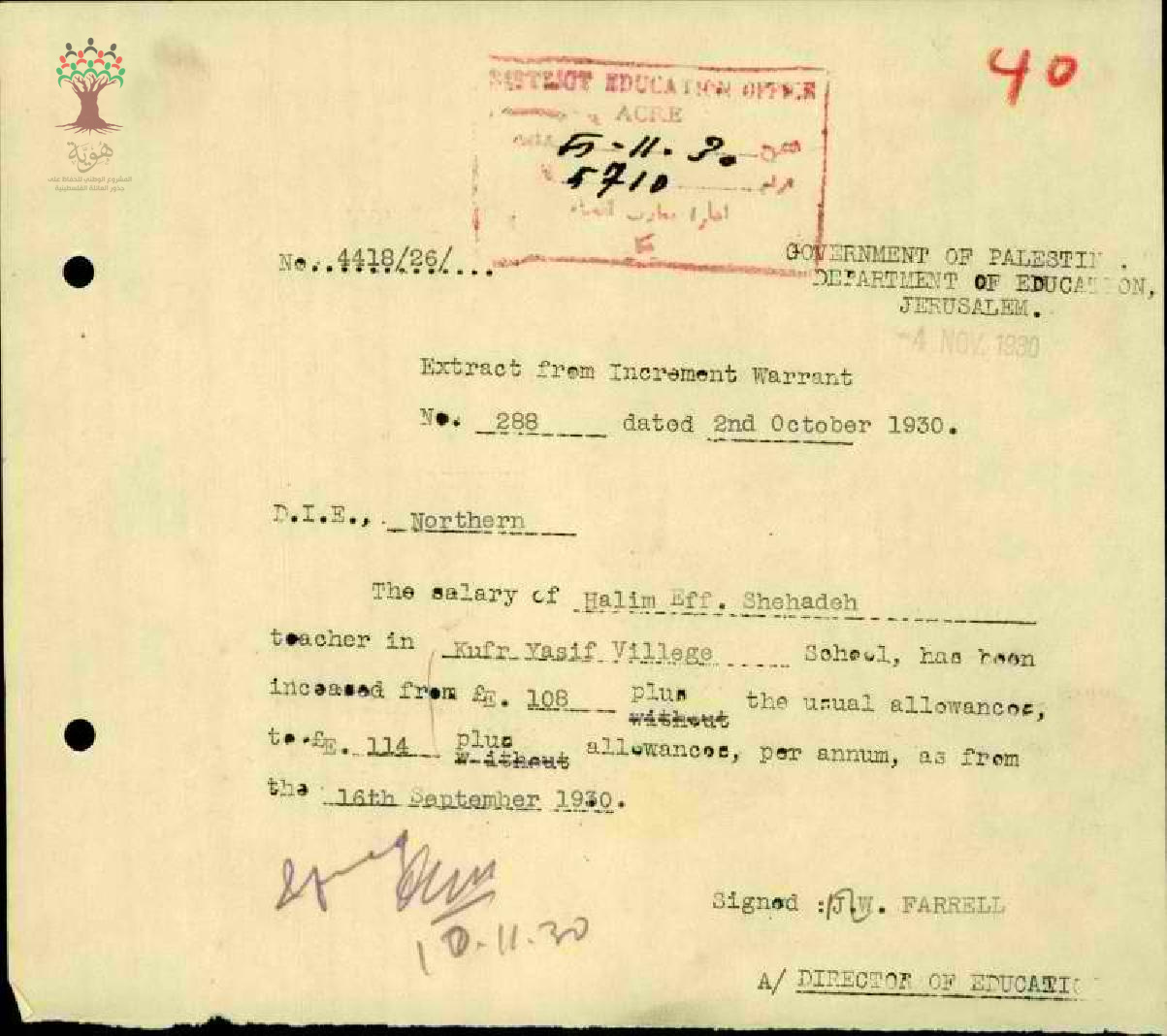 رسالة من مدير المعارف الى مفتش المعارف بخصوص زيادة راتب المعلم حليم شحادة السنوية