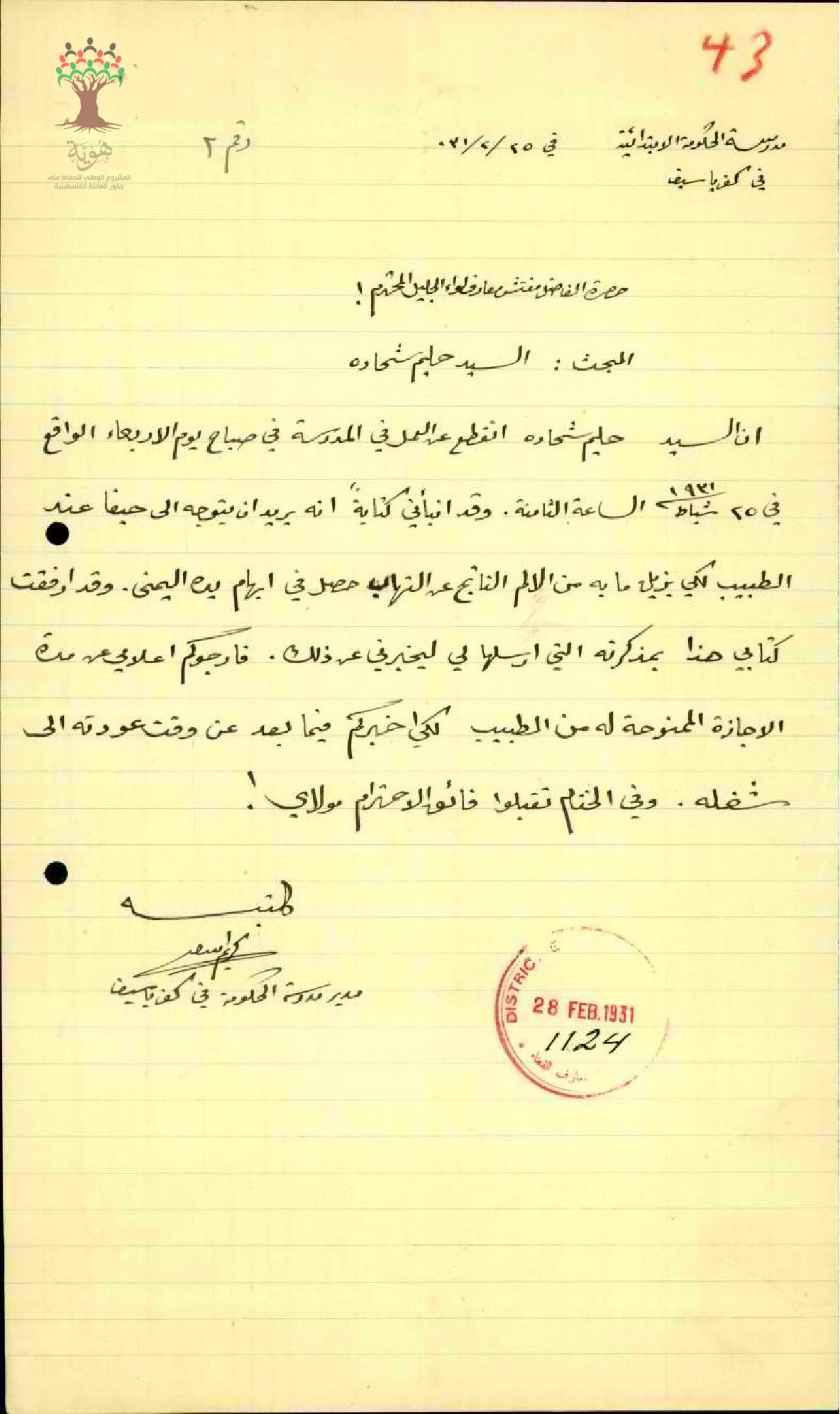 رسالة من مدير مدرسة كفر ياسيف الى مفتش المعارف بخصوص تغيب المعلم حليم شحادة