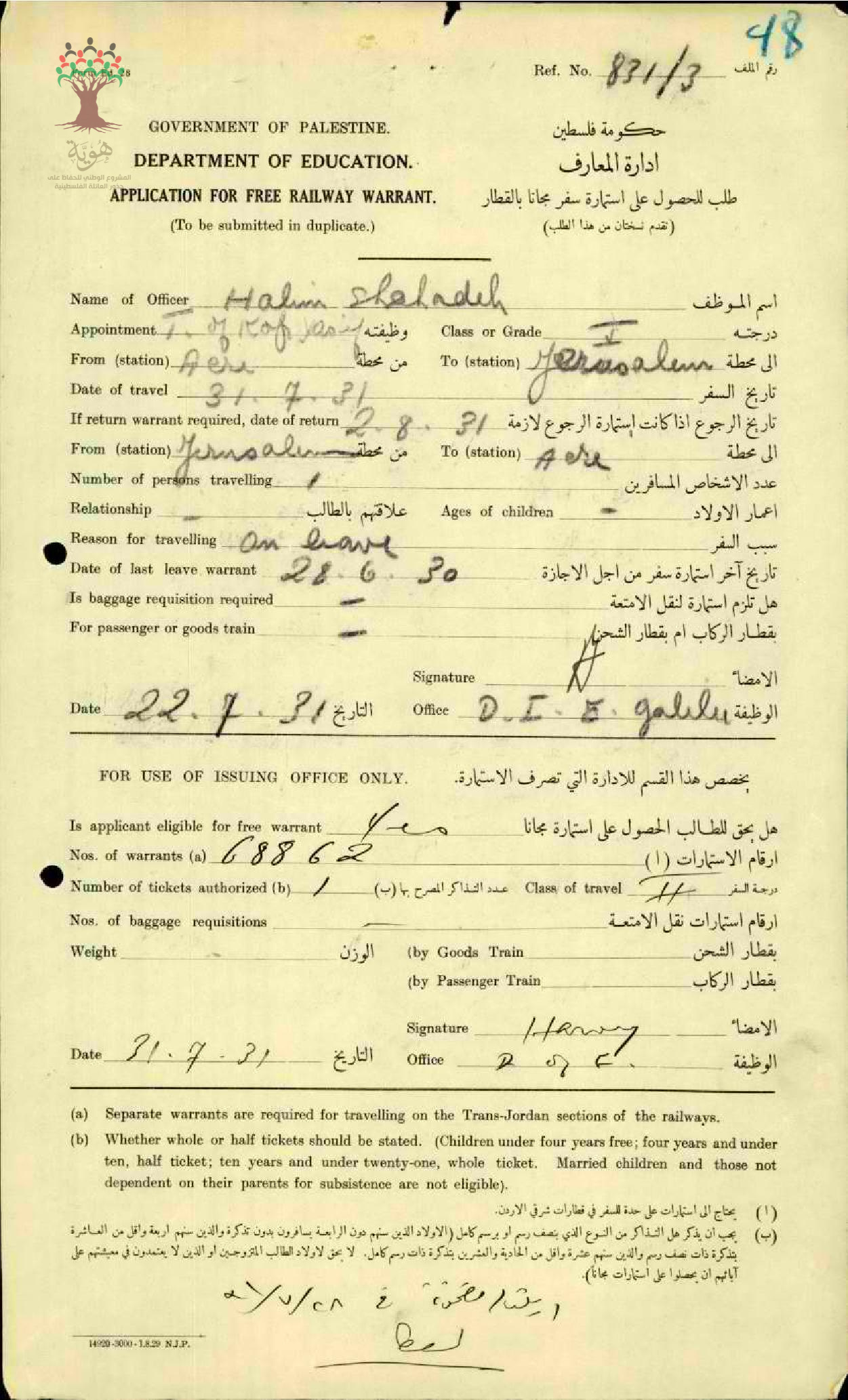 استمارة سفر مقدمة الى المعلم حليم شحادة/كفر ياسيف