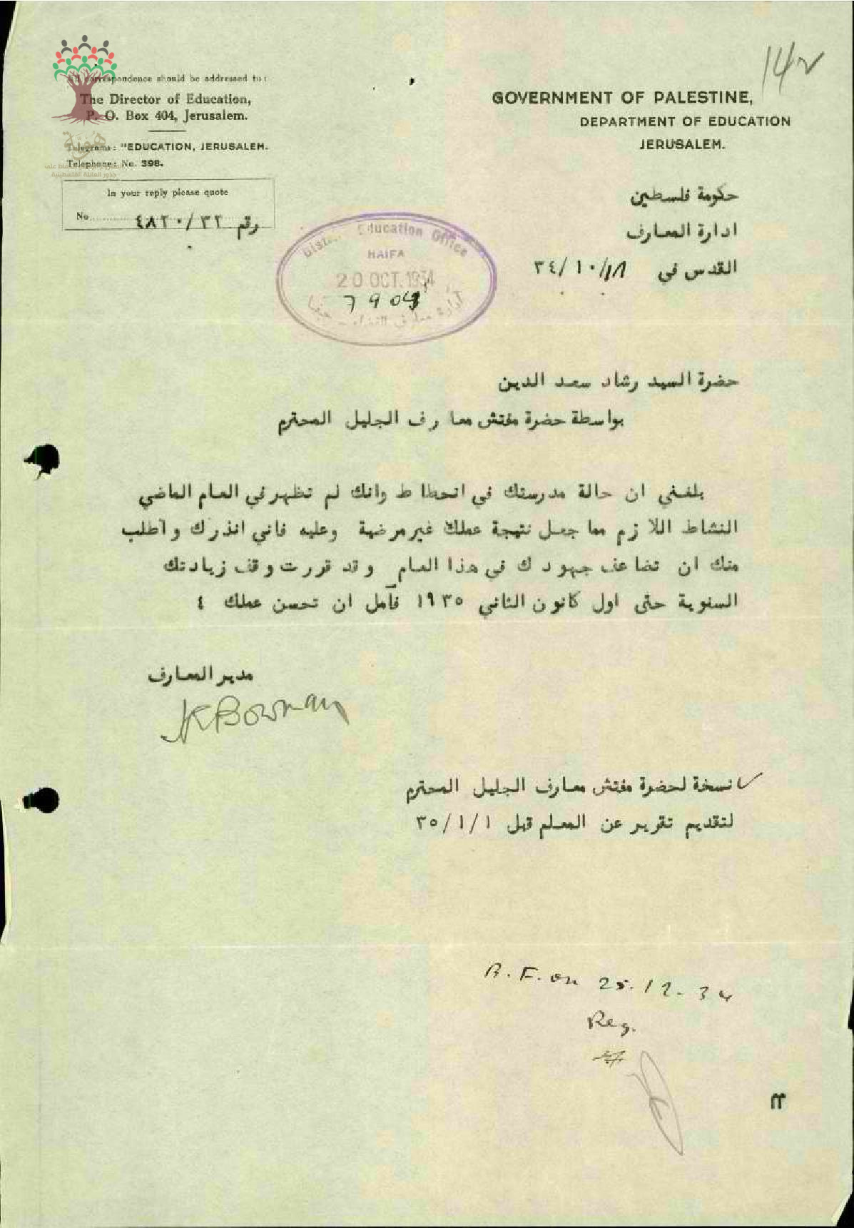 رساله من مدير المعارف الى المعلم رشاد سعد الدين بخصوص حالة مدرستك في انحطاط وانك لم تخبرني في العام الماضي