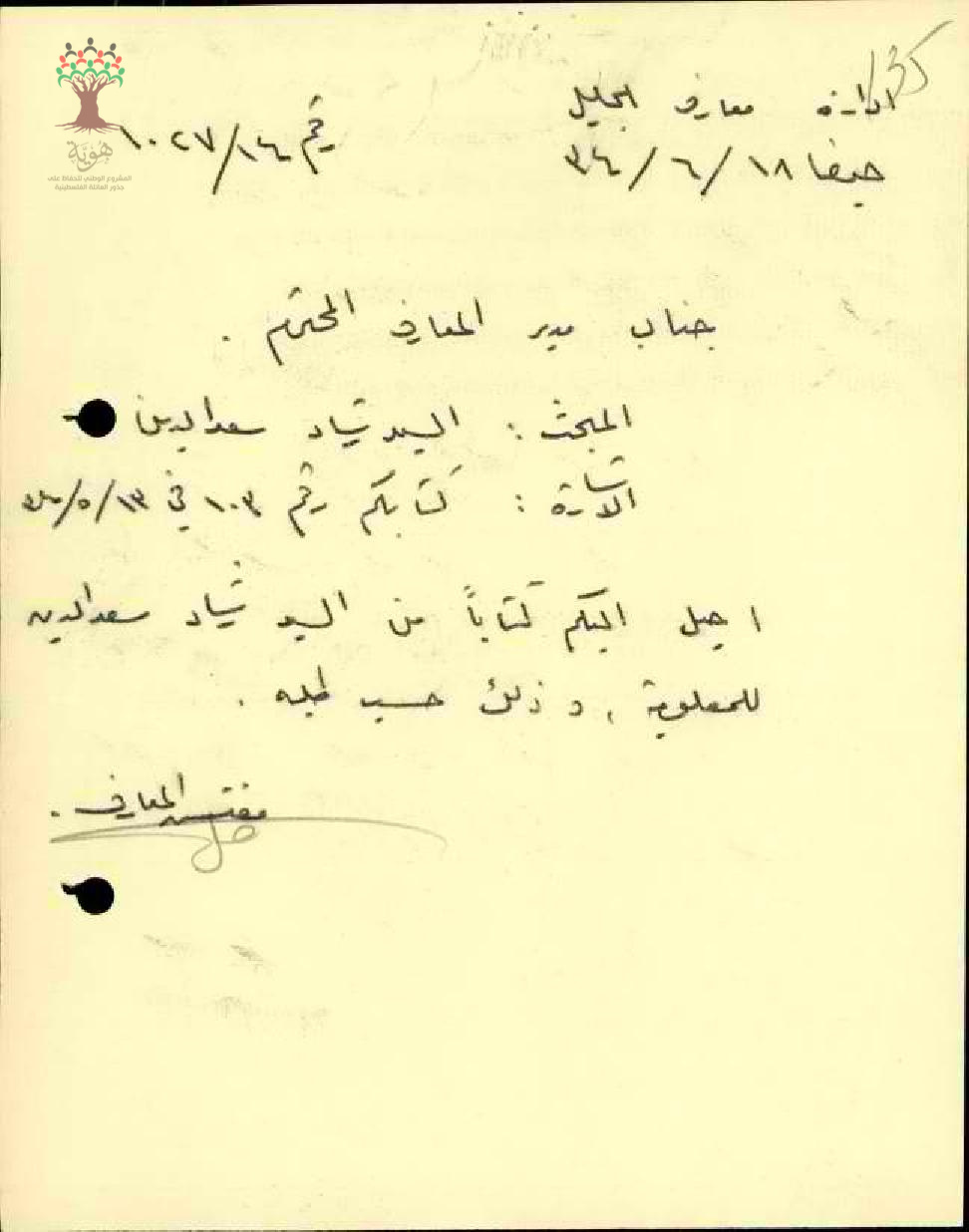 رساله من مفتش المعارف الى مدير المعارف بخصوص المعلم رشاد سعد الدين اشار لكتابكم رقم 103