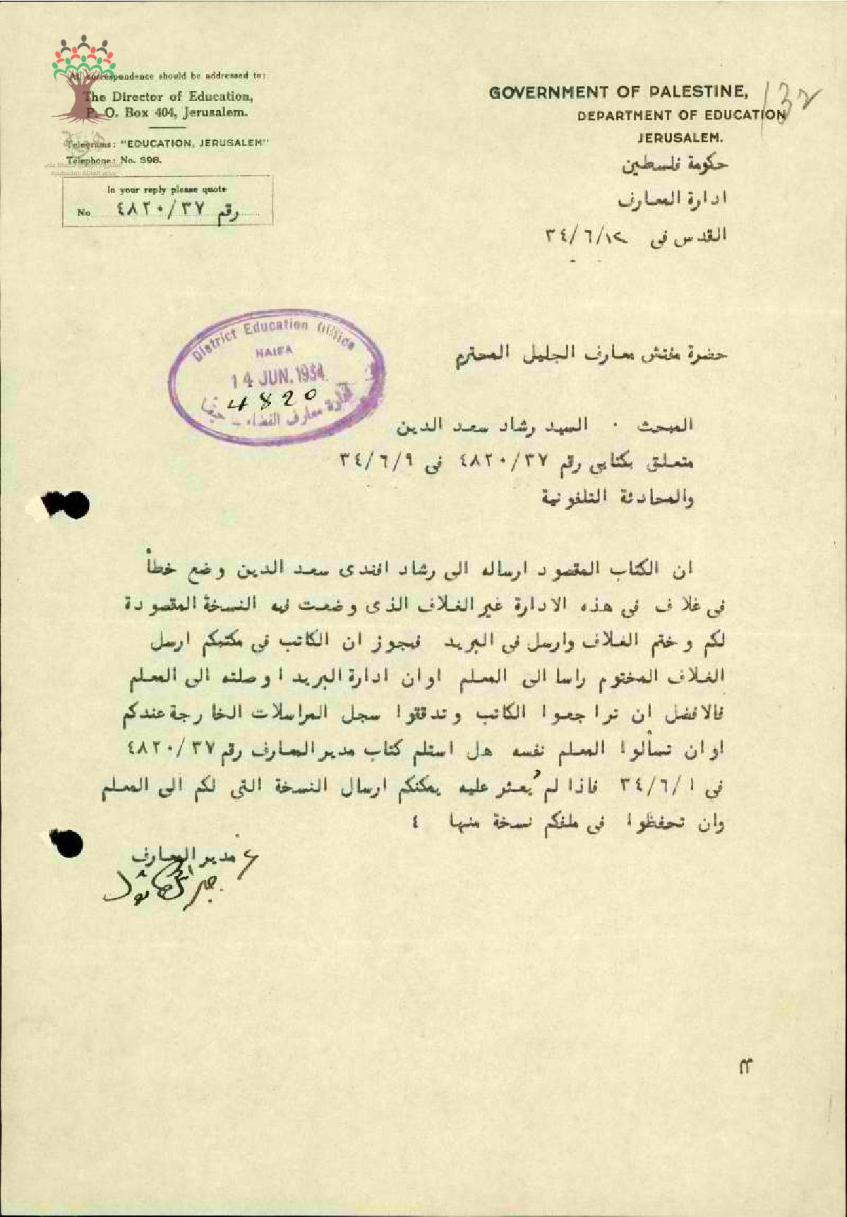 رساله من مدير المعارف الى مفتش معارف الجليل بخصوص المعلم رشاد سعد الدين والمحادثه القانونيه