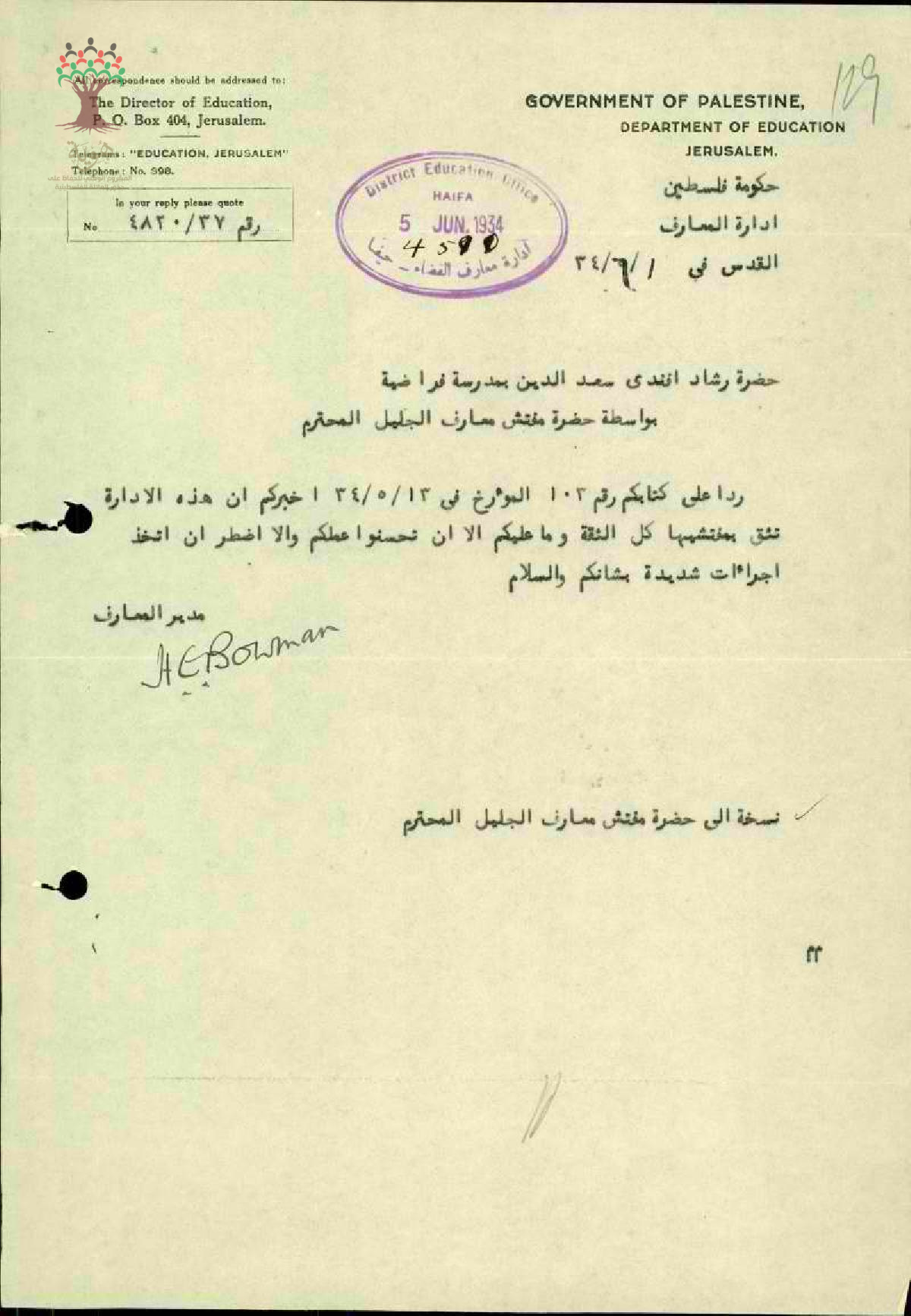 رساله من مدير المعارف الى المعلم رشاد سعد الدين بخصوص اخباركم ان هذه الادارة تثق بمفتشها كل الثقة
