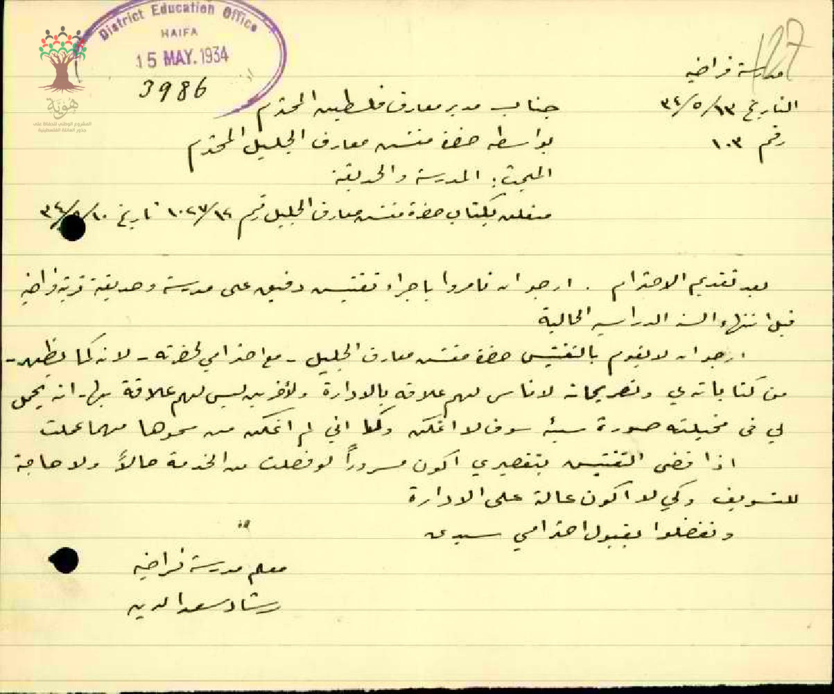 رساله من المعلم رشاد سعد الدين الى مدير المعارف بخصوص اجراء تفتيش دقيق على المدرسه والحديقة قبل انتهاء السنه الدراسيه