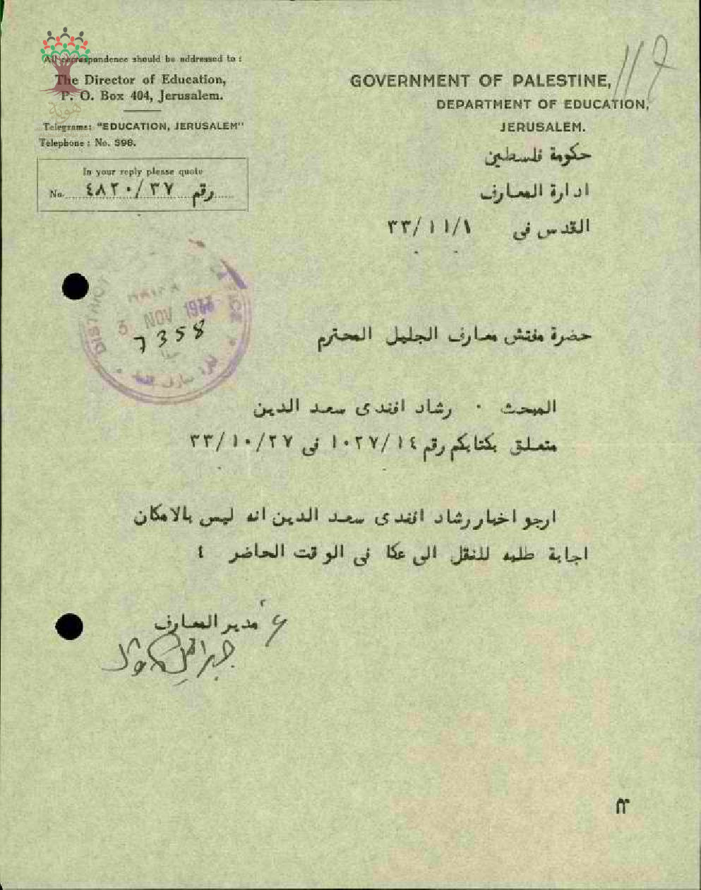 رساله من مدير المعارف الى مفتش معارف الجليل بخصوص اخبار رشاد سعد الدين انه ليس بالامكان اجابة طلب للنقل الى عكا