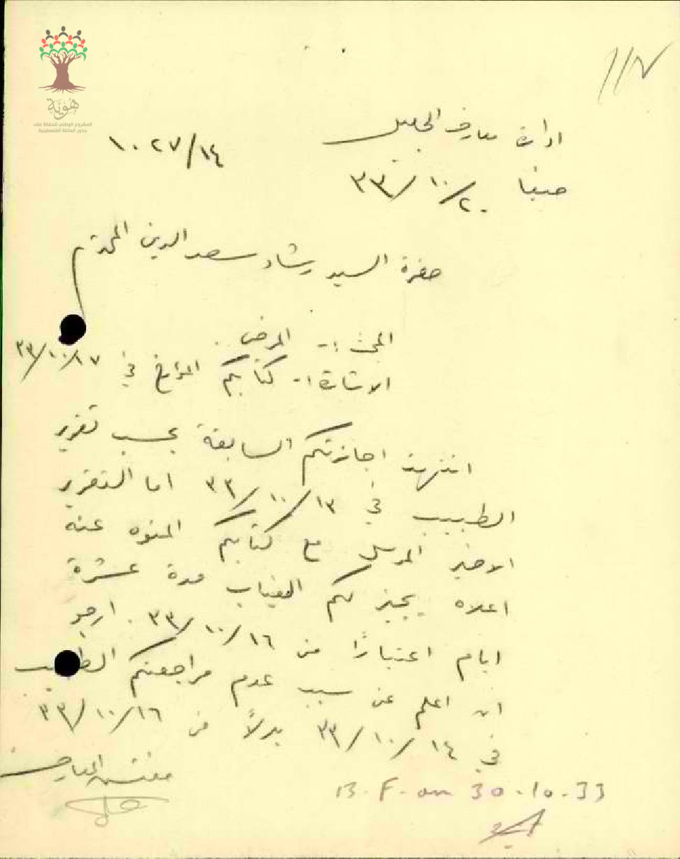 رساله من مفتش المعارف الى المعلم رشاد سعد الدين بخصوص انتهاء اجازتكم السابقة بحسب تقرير الطبي