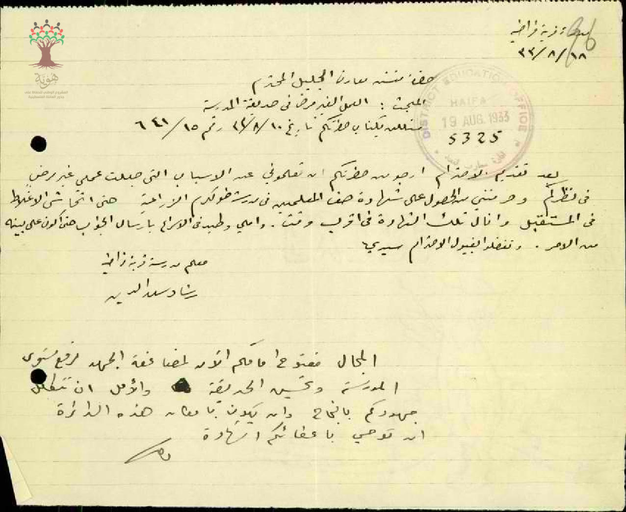 رسالة من معلم مدرسة فراضية رشاد سعد الدين إلى مفتش معارف الجليل بخصوص العمل الغير مرضي في حديقة المدرسة