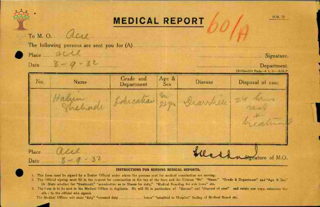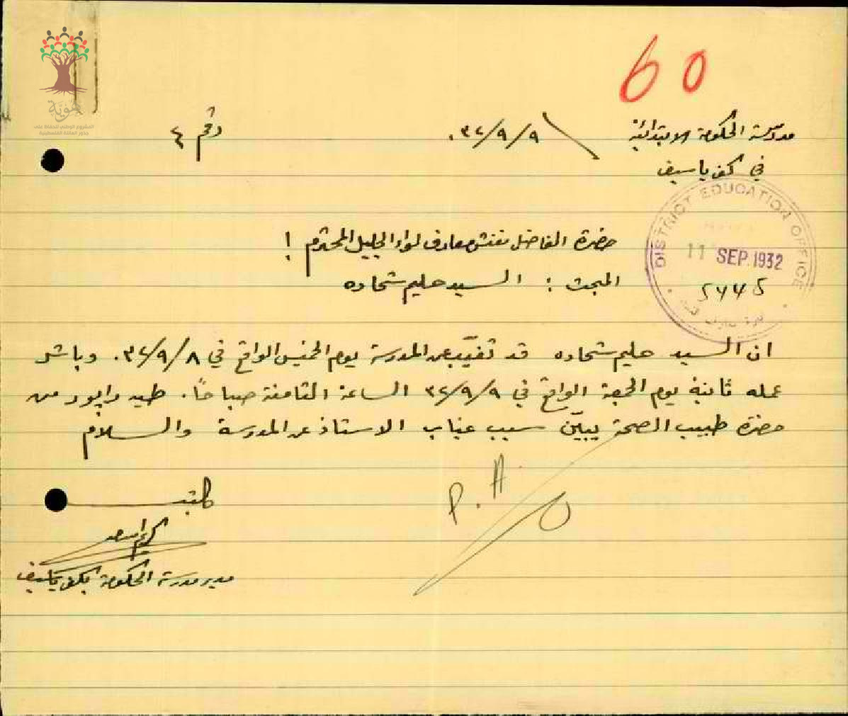 رسالة من مدير مدرسة كفر ياسيف الى مفتش المعارف بخصوص تغيب المعلم حليم شحادة بسبب المرض مرفقة بالتقرير الطبي