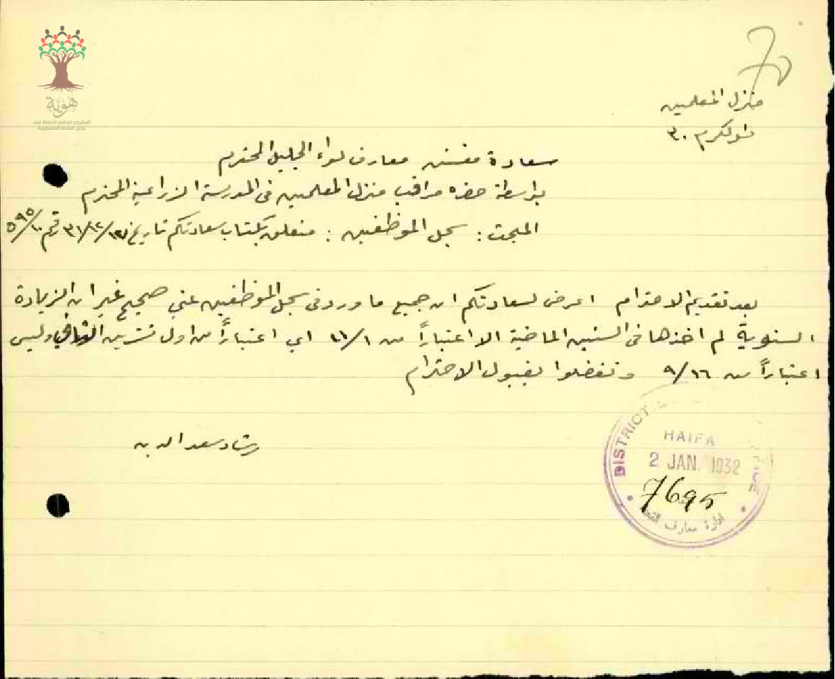 رسالة من معلم مدرسة قرية فراضة رشاد سعد الدين إلى مفتش معارف لواء الجليل بواسطة حضرة مراقي منزل المعلمين في المدرسة الزراعية بخصوص سجل الموظفين