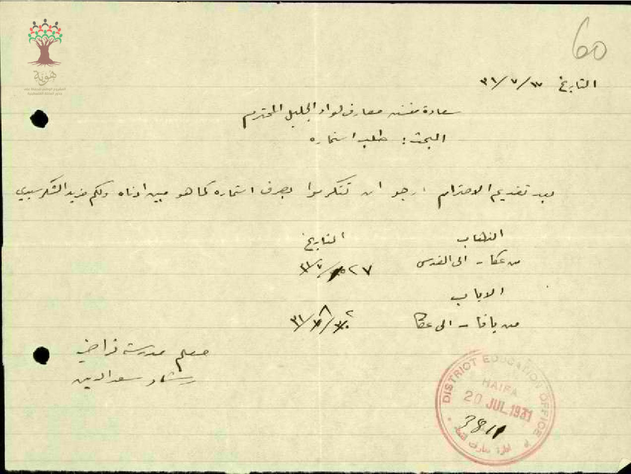 رساله من المعلم رشاد سعد الدين الى مفتش معارف الجليل بخصوص طلب استماره