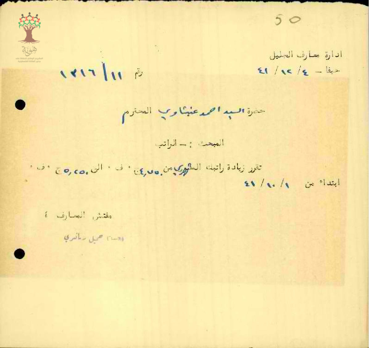 رسالة من مفتش المعارف إلى المعلم أحمد عنبتاوي يخبره بقرار زيادة راتبه الشهري
