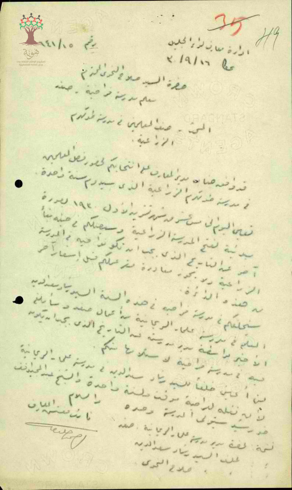 رسالة من سعادة نائب مفتش معارف الجليل إلى السيد صلاح النحوي المحترم معلم مدرسة فراضية صفد بخصوص صف المعلمين في مدرسة طولكرم الزراعية