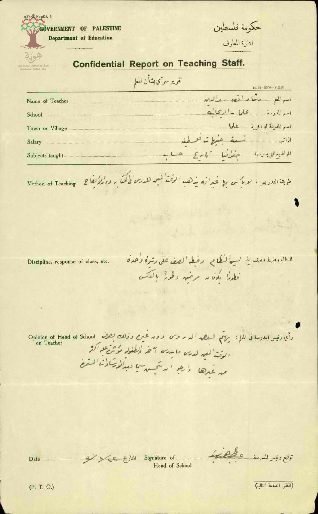 ادارة المعارف تقرير سري بشان المعلم رشاد سعد الدين