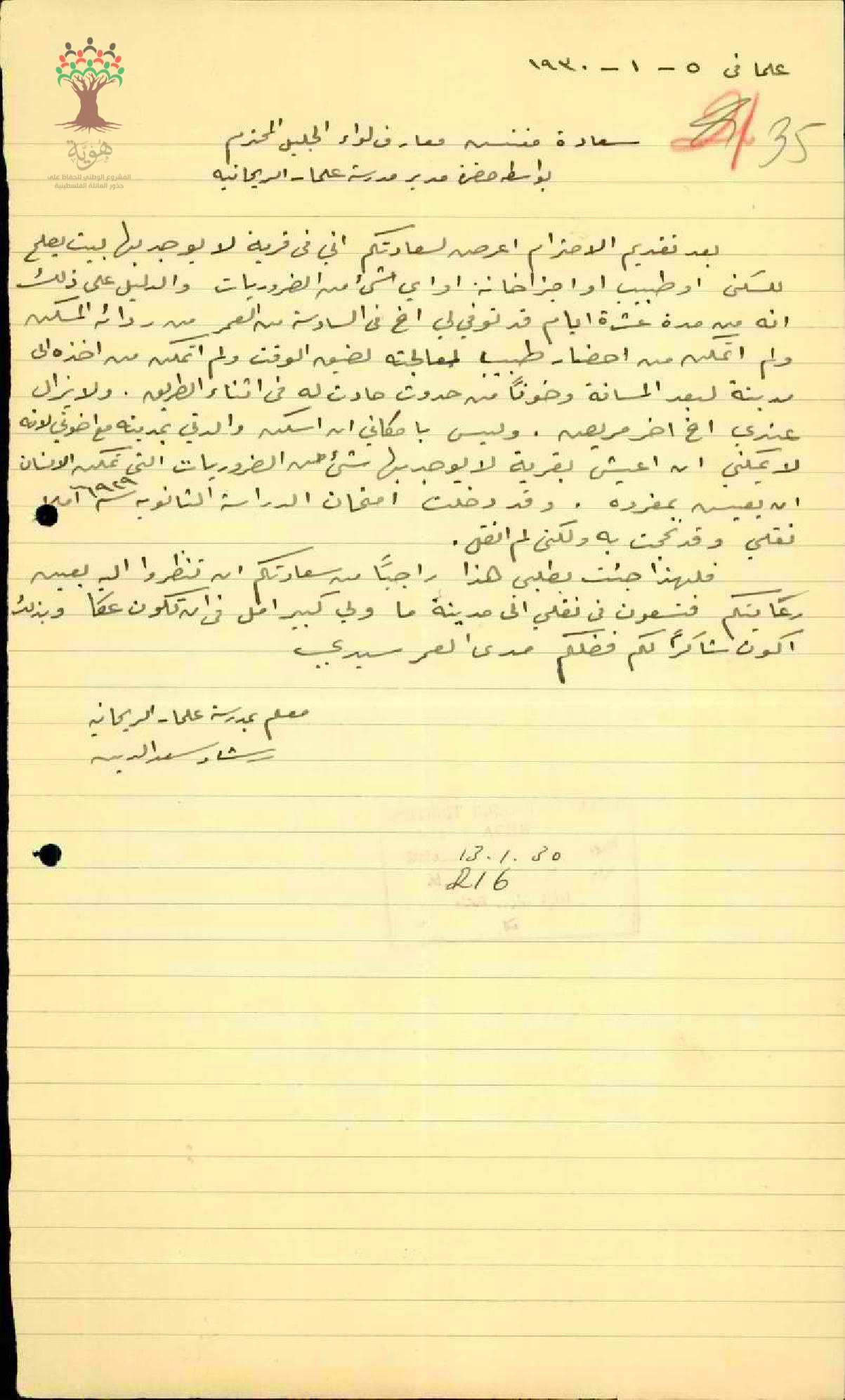 رساله من المعلم رشاد سعد الدين الى مفتش معارف الجليل بخصوص اخباركم اني في قرية لا يوجد بها بيت للسكن