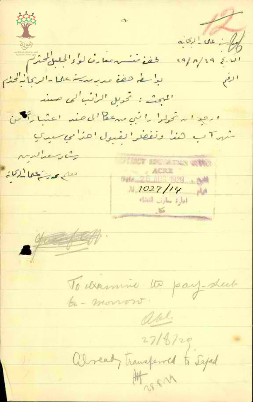 رساله من المعلم رشاد سعد الدين الى مفتش معارف الجليل بخصوص تحويل الراتب الى صفد