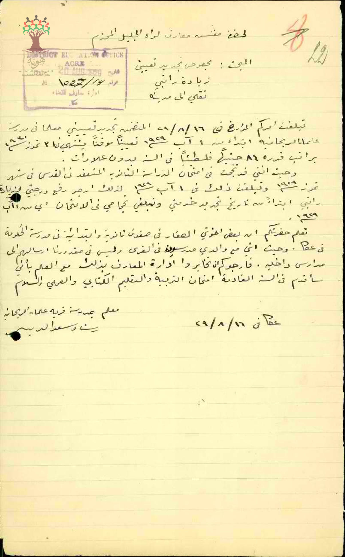 رساله من المعلم رشاد سعد الدين الى مفتش معارف الجليل بخصوص زيادة الراتب والنقل الى المدينه