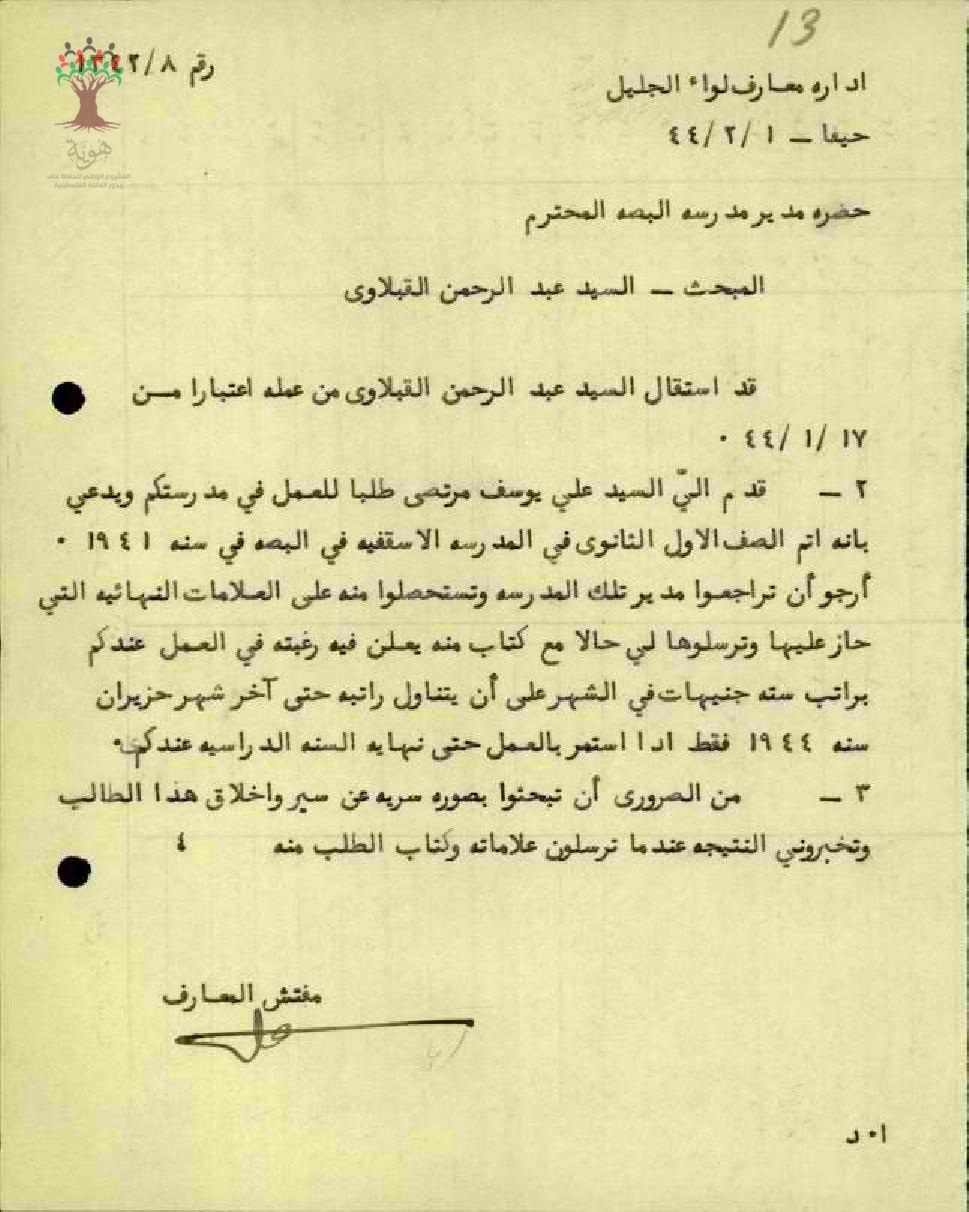رساله من مفتش المعارف الى مدير مدرسة البصه بخصوص استقاله المعلم عبد الرحمن قبلاوي عن العمل