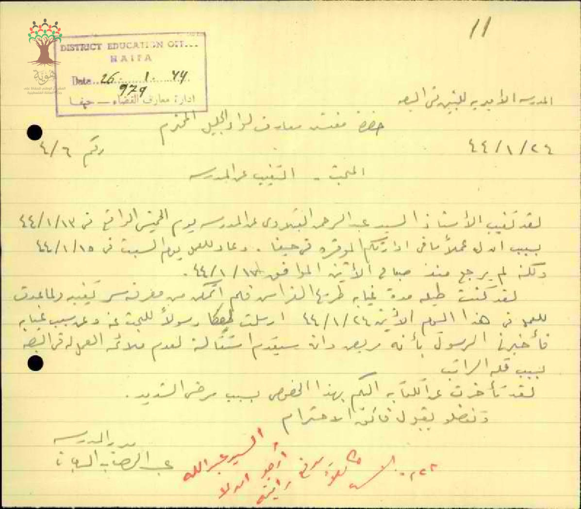 رساله من المعلم عبد الرحمن قبلاوي الى مفتش معارف الجليل بخصوص التغيب عن المدرسه