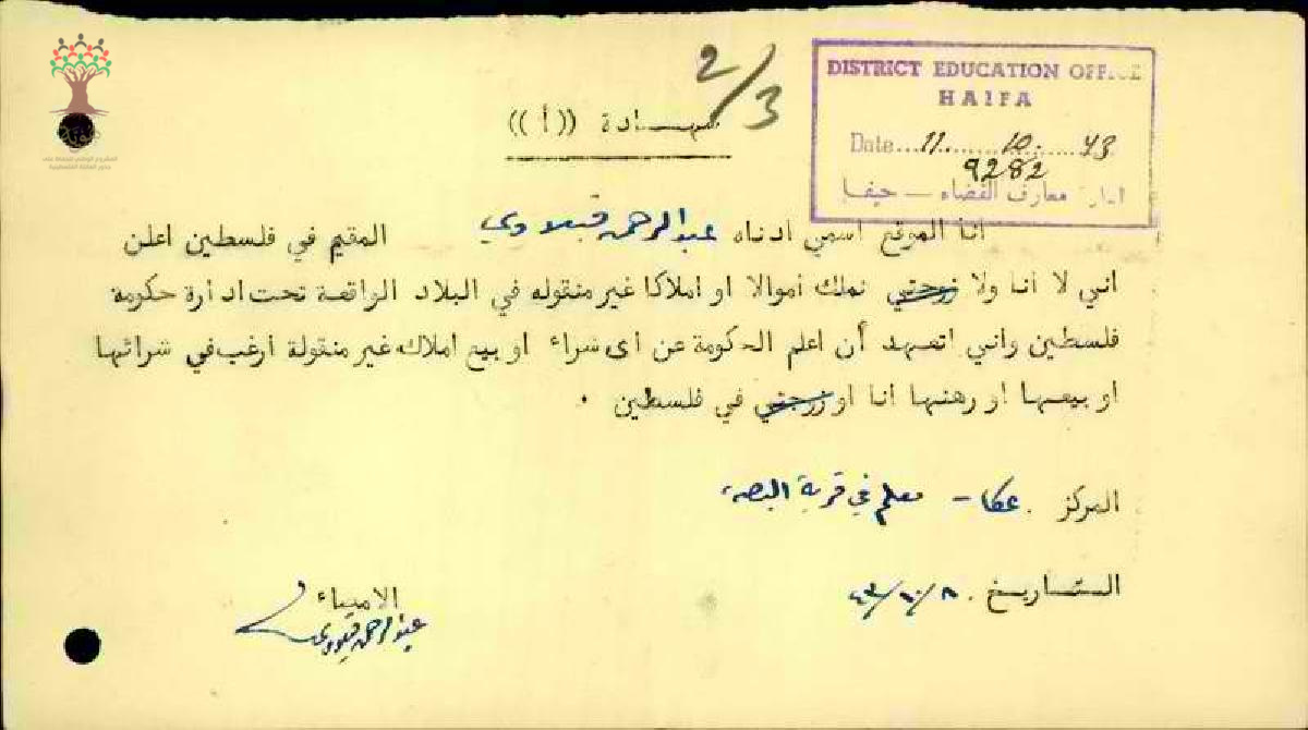 رساله من المعلم عبد الرحمن قبلاوي الى ادارة القضاء اني لا امتلك اموالا او املاك غير منقول في البلاد
